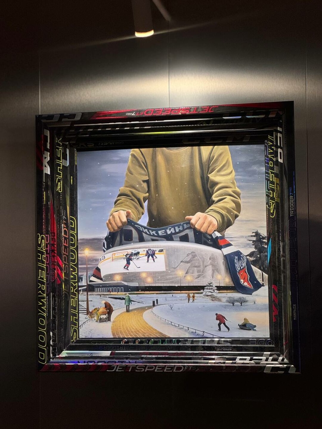 До конца января в музее выставляют картину «Оберег», на которой резидент студии «Тихая» Андрей Оленев изобразил фасад новой ледовой арены. Багет для полотна сделали из хоккейных клюшек. Многофункциональный спорткомплекс на Стрелке будет вмещать 12 тысяч зрителей, помимо матчей здесь можно будет проводить концерты, форумы и другие крупные мероприятия. Основа фасада — портреты хоккеистов «Торпедо» в динамической проекции. Дополняет композицию большой медиаэкран, он предназначен для проведения спортивных трансляций и показа различного визуального контента.