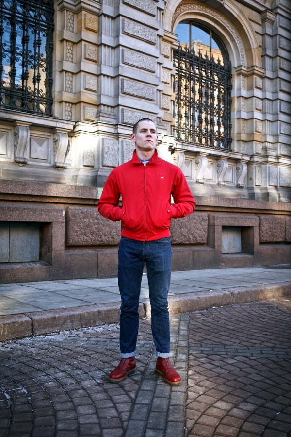 Поло секонд-хенд, куртка Fred Perry, джинсы Levi's 501, обувь Dr. Martens.