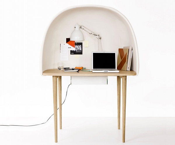 Стол итальянско-датского дуэта дизайнеров Gam Fratesi «кокон» для работы. Он выполнен из орехового дерева и шумоизолирующей шерсти, которая вдобавок защищает от солнечного цвета и фильтрует запахи.