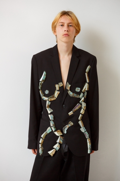 Фэшн-карьера Ромы Уварова из Краснодара началась с выхода первых футболок с авторской вышивкой. Но позже 21-летний вундеркинд перешел к более сложным конструкциям и материалам: рентгеновским снимкам, резиновым пупсам, битому стеклу, светоотражающей фольге для окон, гобеленам с оленями и игрушечной обуви. Все это появляется на бланковой одежде в самых экстремальных формах, которые Рома демонстрирует на собственных презентациях и показах.
