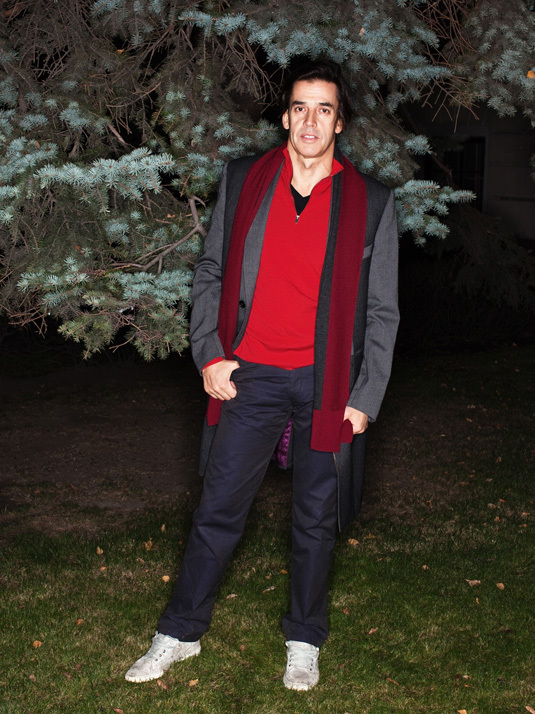 На Семене: Свитшот Jil Sander, пальто Kenzo, брюки Trussardi, обувь Costume National, шарф куплен на Мерлоуз-плейс, часы Breguet.