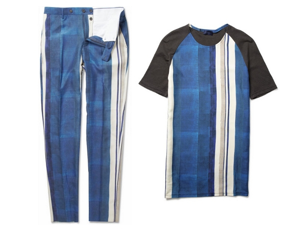 Ироничный Альбер Эльбаз переосмыслил штаны с лампасами. Футболка и брюки со вставками из голубого и кремового шелка напоминают форму отечественного военно-морского флота.