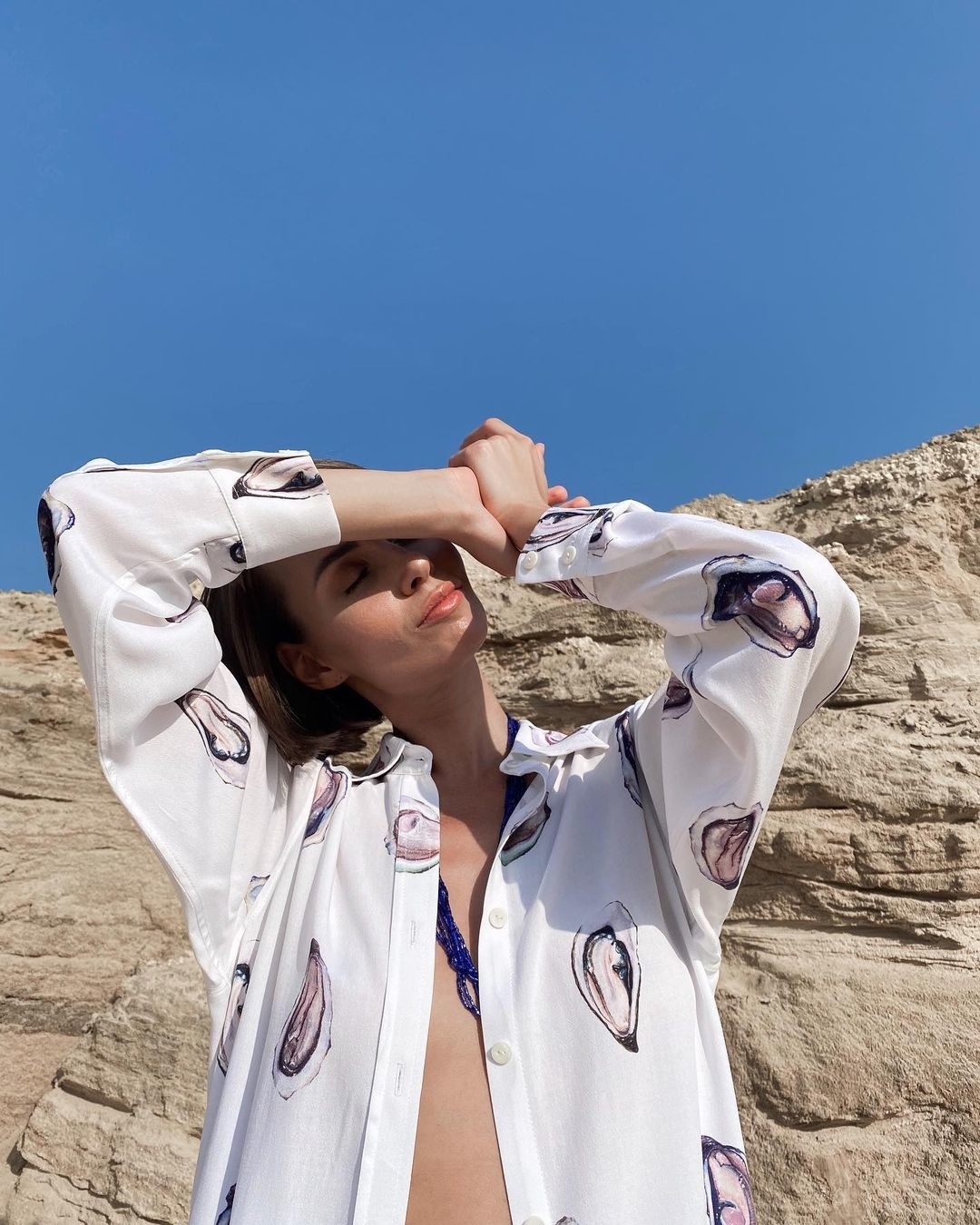 Лучший аксессуар к этой блузе с устрицами от MASHKARA - бокал шампанского на тонкой ножке. А там уже и до Лазурного берега рукой подать! Слышите шум Средиземного моря? Нет? А вы приложите ухо к ракушке.
