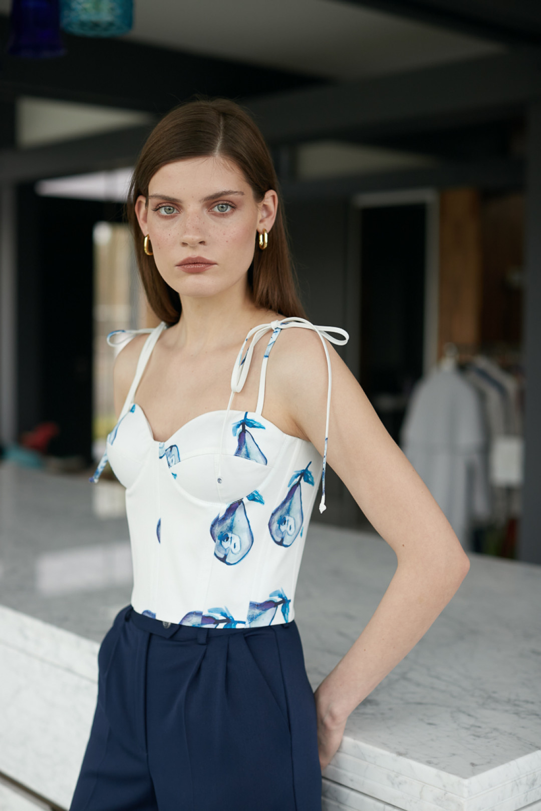 «Висит груша, нельзя скушать» – главная фуд-загадка из детства. Хотя, в случае с топом-бюстье от Śelect Studio, правильнее говорить не «висит», а «идеально сидит». Принт с прохладно-голубыми грушами намекнет окружающим, что за вашей ледяной красотой прячется по-настоящему нежная натура.