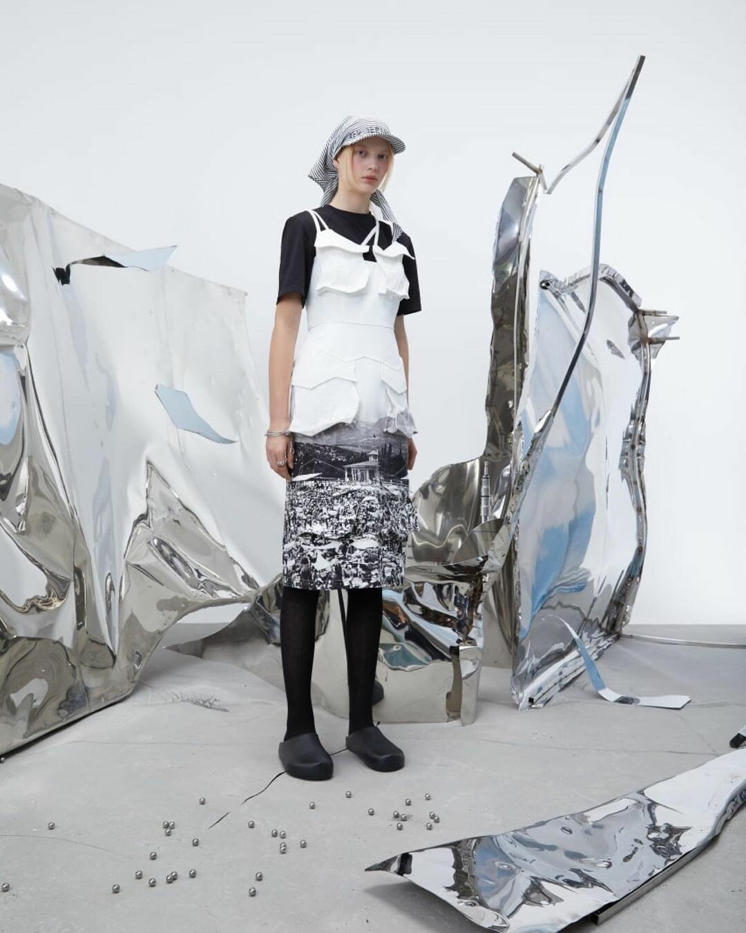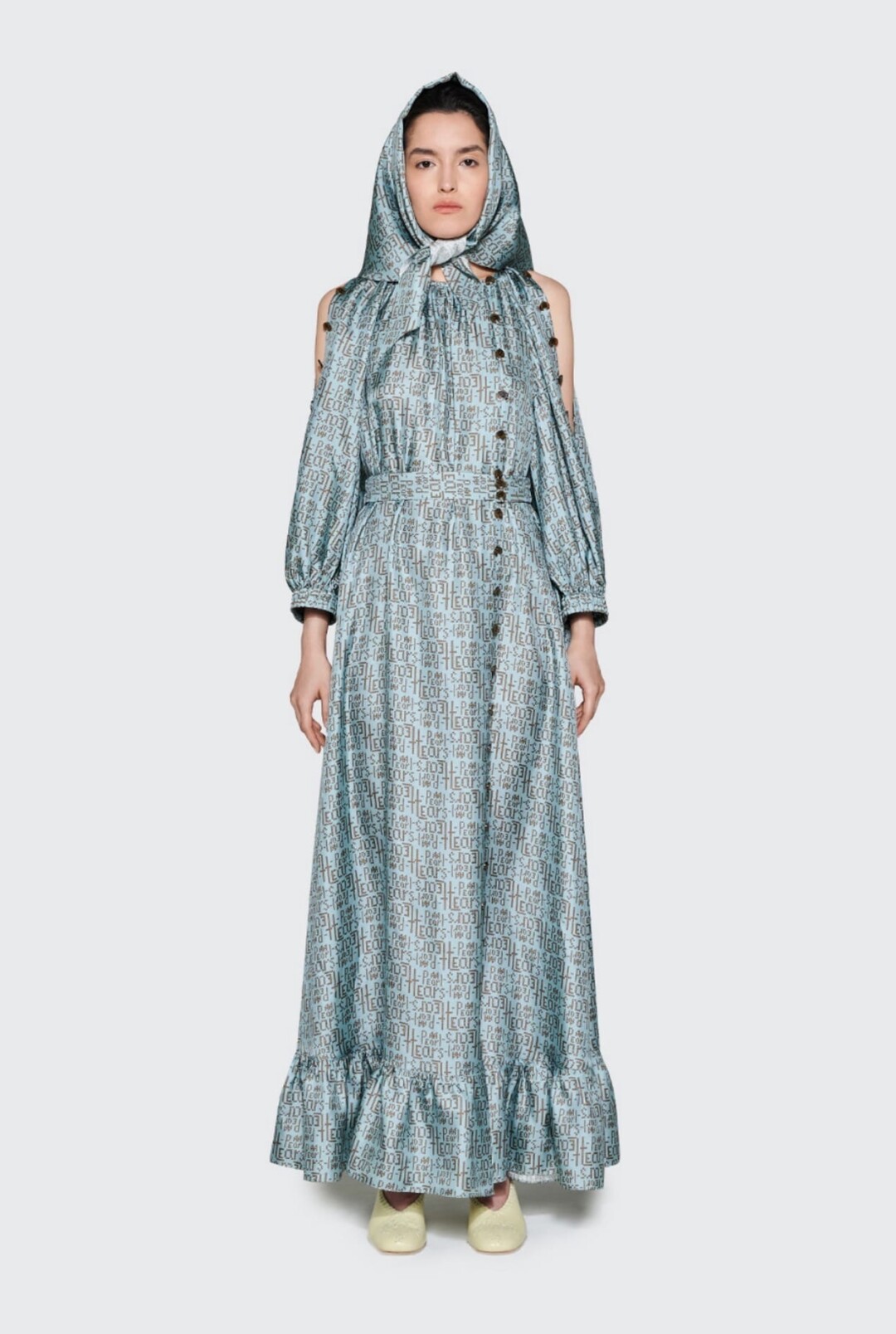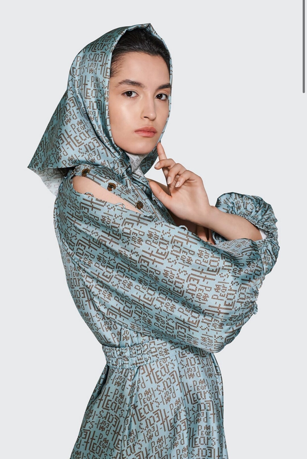 В этом образе соединились русские традиции и актуальные тренды. Платье из серо-бирюзового шелка с шрифтовым принтом, будто вышитым крестиком - элементы старинных русских узоров на тончайшей ткани. Изящная и волшебная интерпретация Снегурочки, украшенная сказочным северным орнаментом.