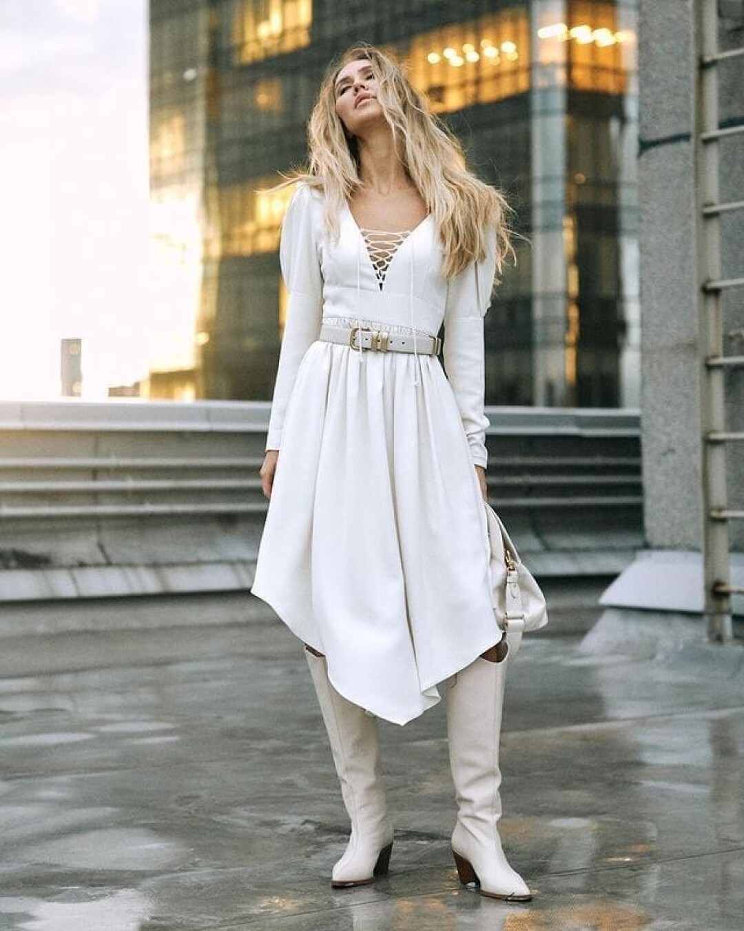 Чуть более дерзкий, но не менее волшебный образ. Платье, созданное по мотивам кафтанов царевны из сказок, плотная ткань и смелый вырез – сразу видно, что за холодным фасадом такой Снегурочки пылает нешуточный огонь. Белые казаки – отсылка к царским остроносым сапогам из рассказов о смелых, отважных барышнях.