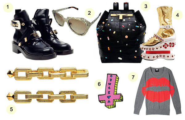 1. Ботинки Balenciaga. 2. Очки Karen Walker. 3. Рюкзак Damien Hirst x The Row. 4. Туфли на платформе Prada. 5. Серьги Eddie Borgo. 6. Значок Odd Future. 7. Свитшот Markus Lupfer