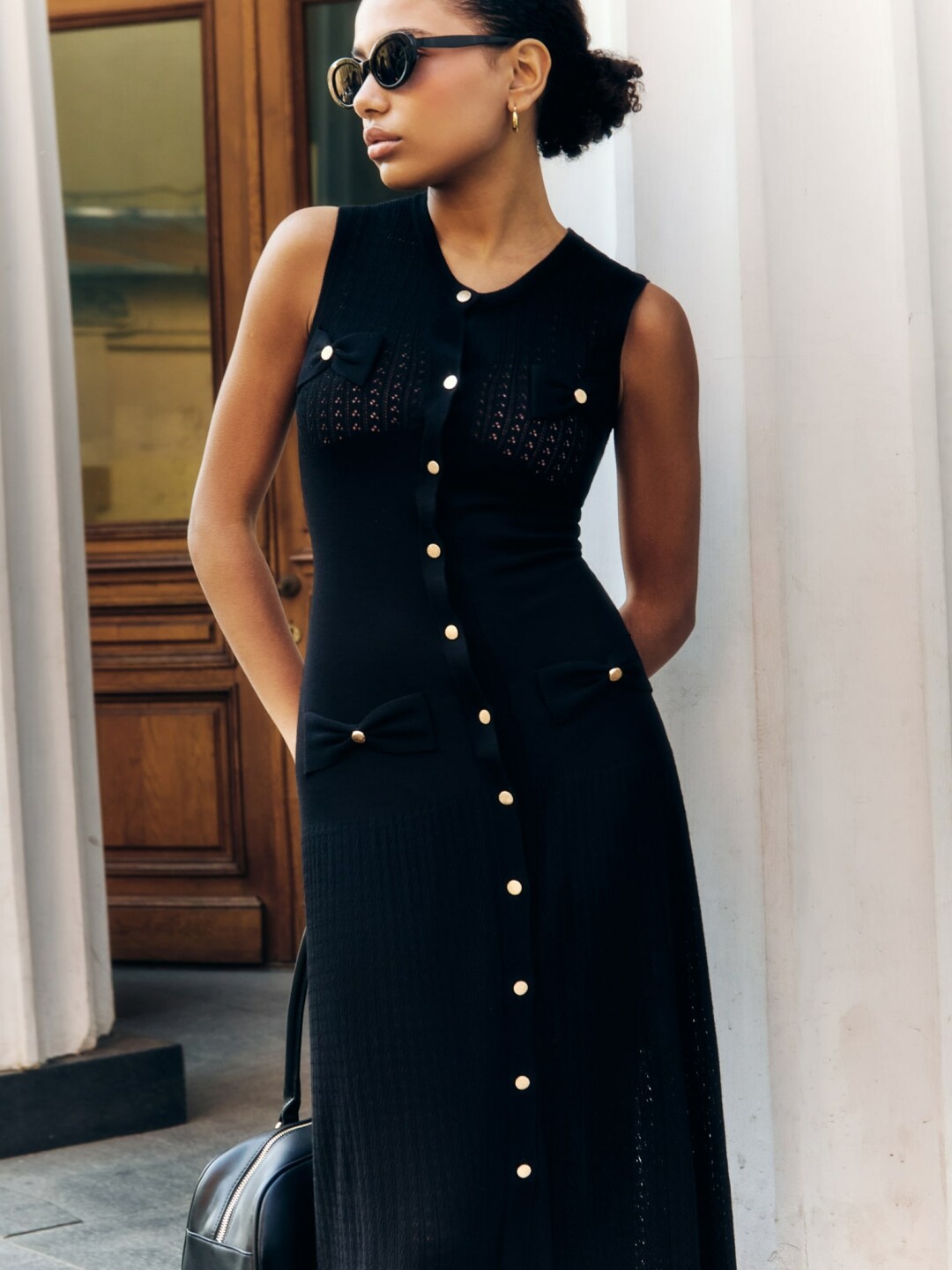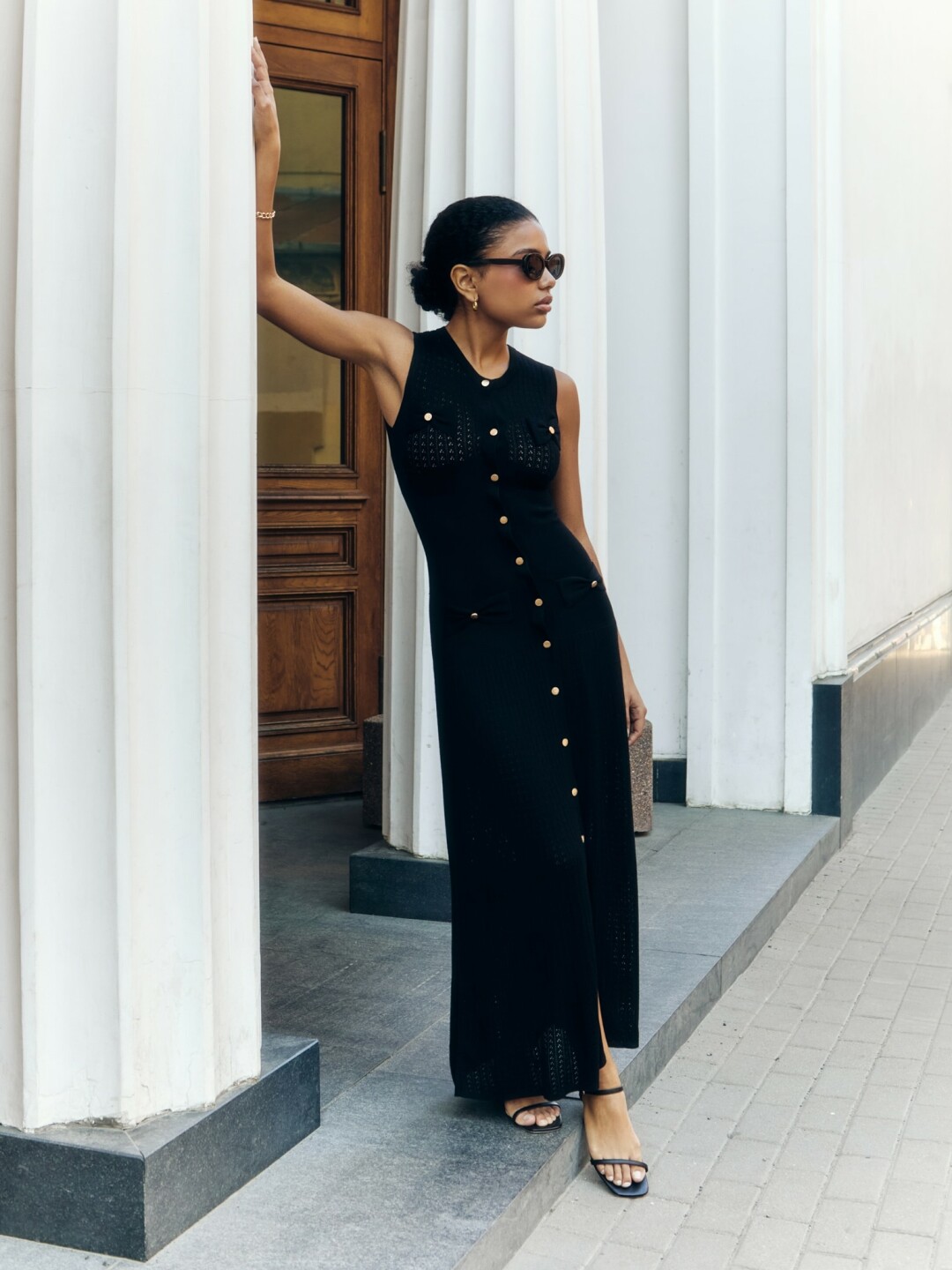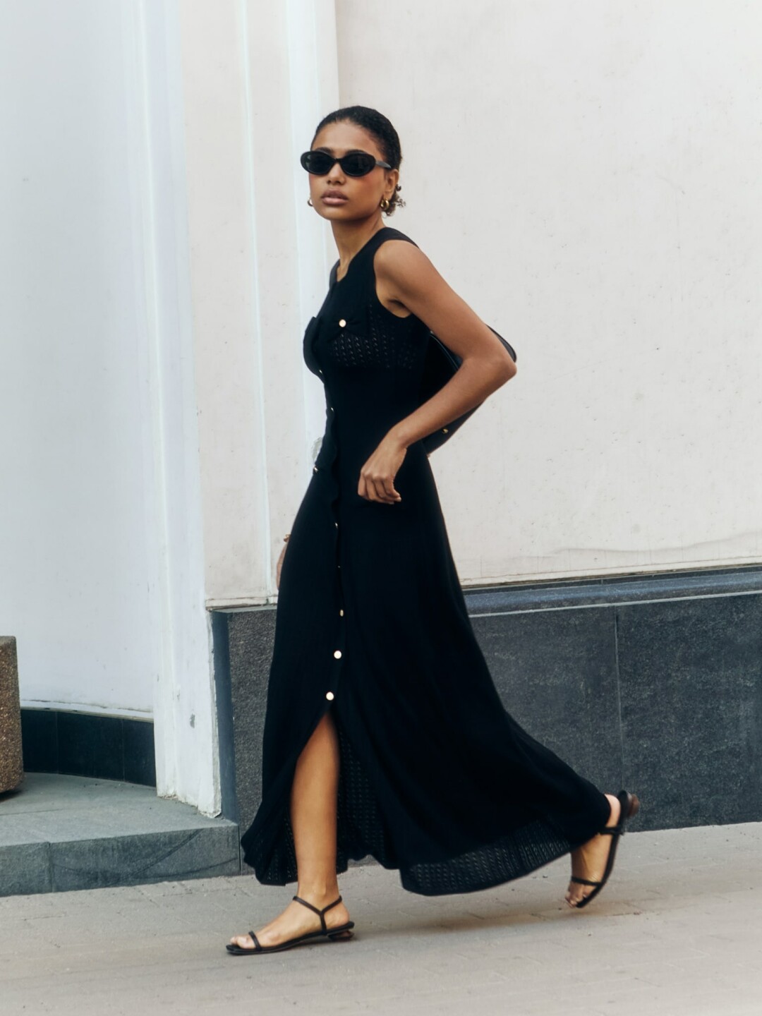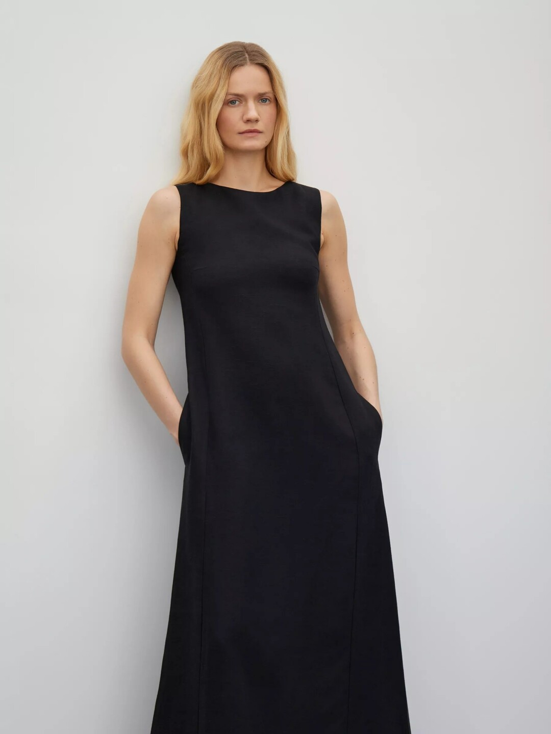 Лаконичное черное бренда EMKA из вискозы со льном — для независимых и самодостаточных. Очень простое спереди, она запоминается эффектной шнуровкой на спине. Достаточно скинуть пиджак, кардиган или жакет (а отсутствие рукавов облегчает подбор таких комплектов) — и скромный закрытый наряд превращается в вечерний вариант. Заказать платье можно на сайте, а совсем недавно бренд открыл свой офлайн-магазин в Нижнем Новгороде.