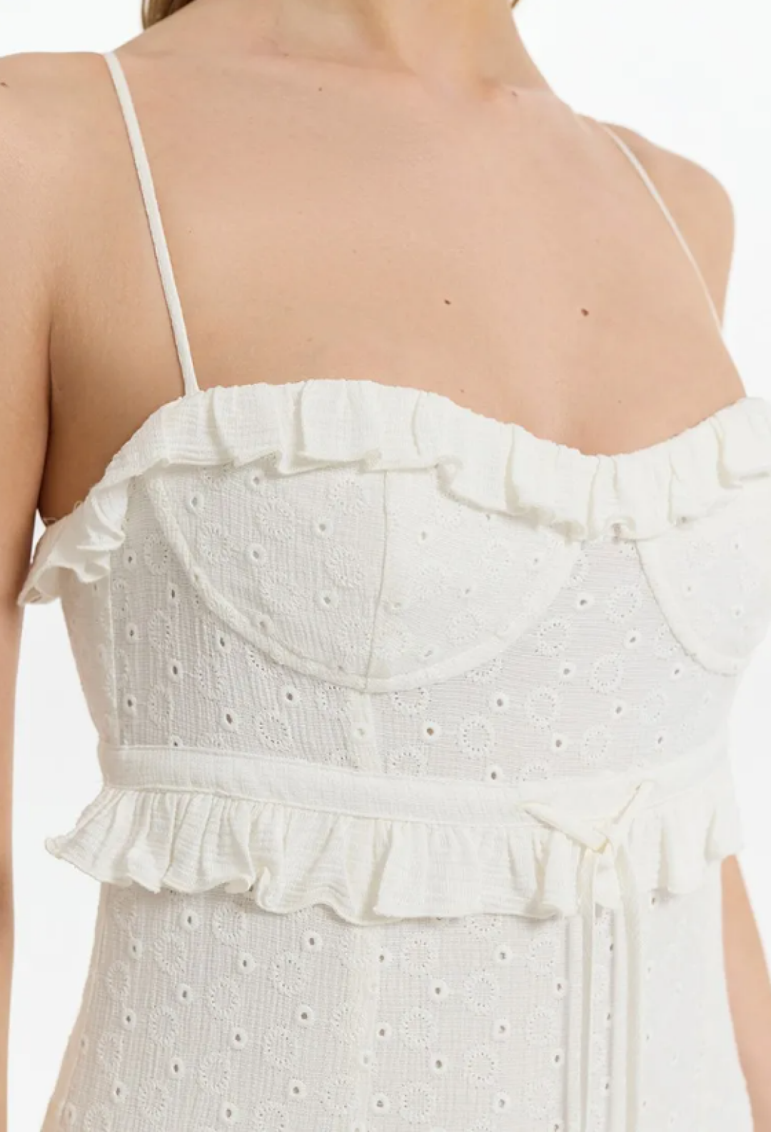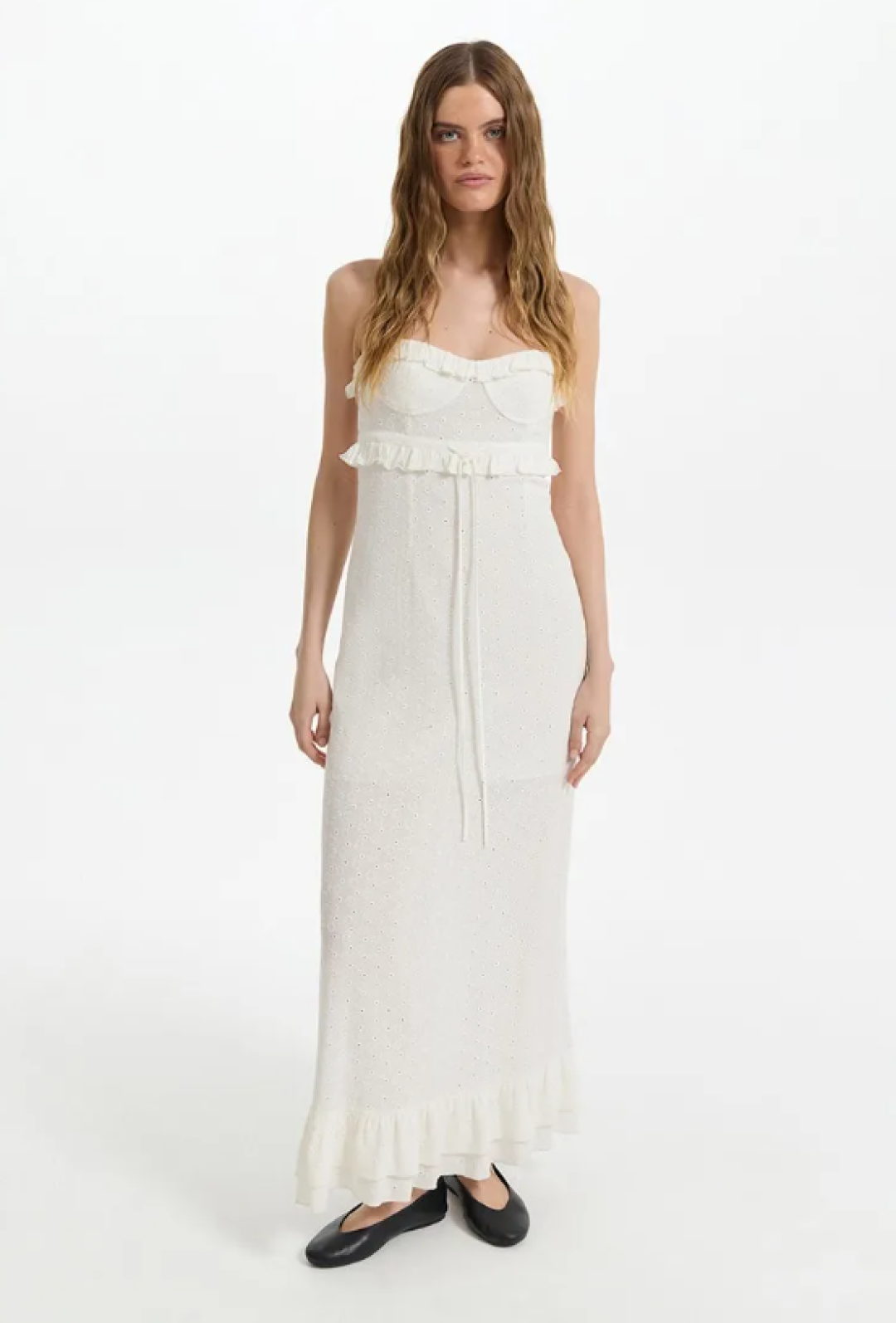 Белоснежное платье-сарафан в длине макси от Love Republic — отличный повседневный вариант в постоянные нижегородские +30 градусов по Цельсию. Актуальным модель делают элементы кроше и имитация лифа с оборками. Это вискоза на хлопковом подкладе — такое платье неплохо держит форму (и помогает держать ее вам!). Модель уже раскупили на официальном сайте бренда, но ее легко можно найти на популярных маркетплейсах.