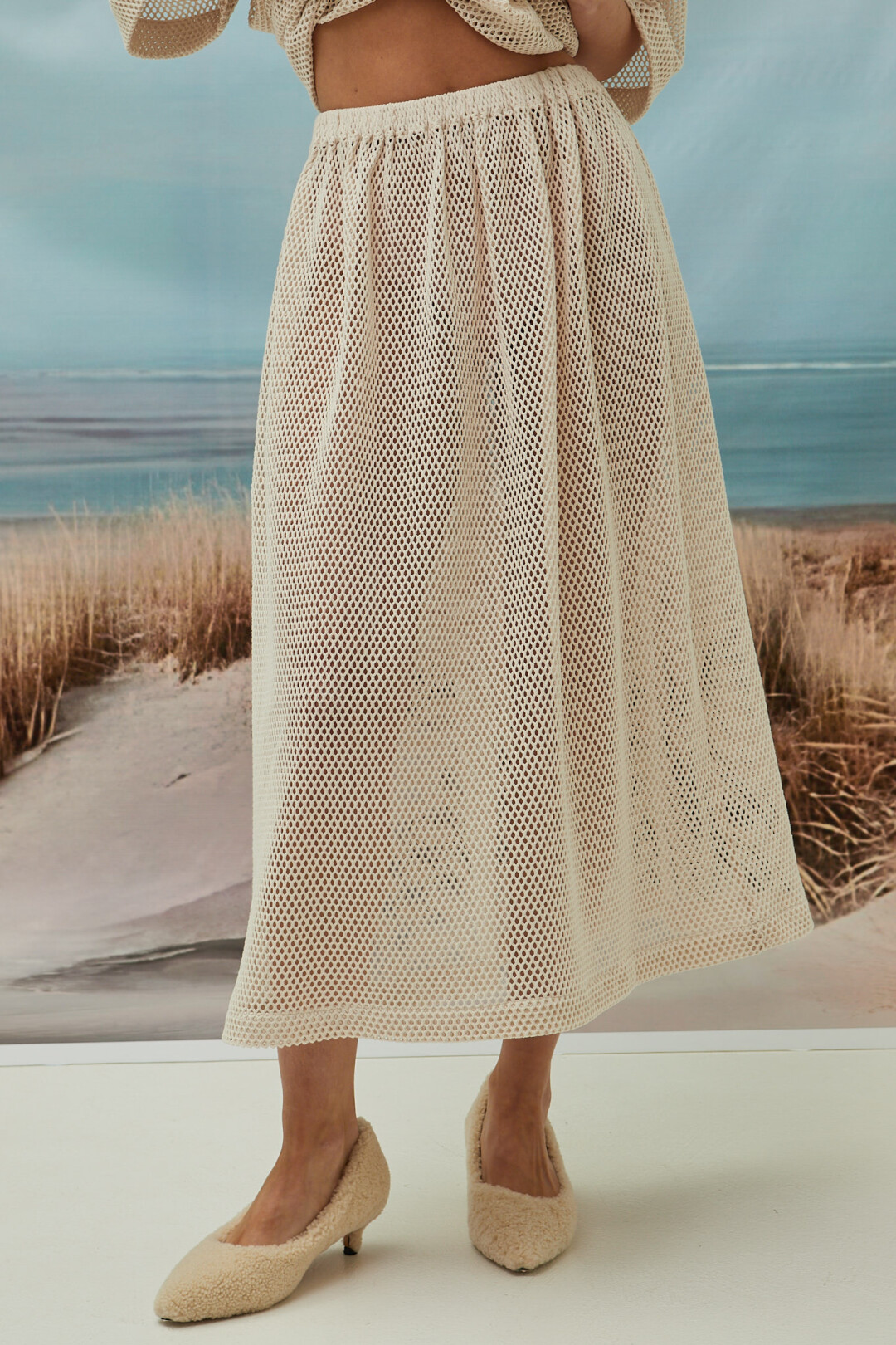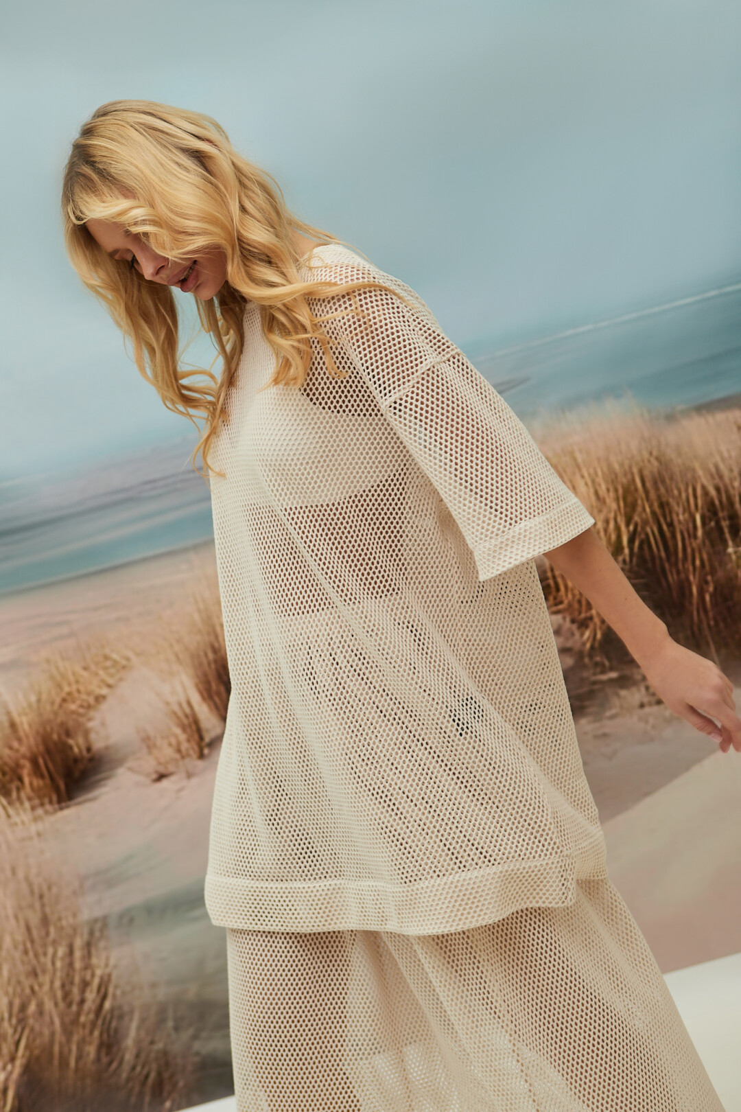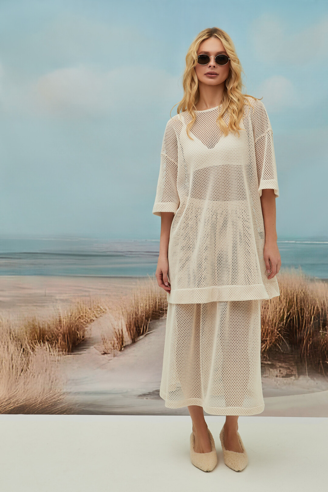Нижегородский бренд TIU тоже взял за основу один из главных трендов лета 2024 — прозрачность — и предложил свой вариант one size. Но это не совсем платье, а костюм из юбки со удлиненной футболкой. Последнюю можно носить и как свободную тунику — на случай, если миди-длина юбки покажется слишком консервативной. Натуральный хлопок без капли п/э добавляет комфорта.