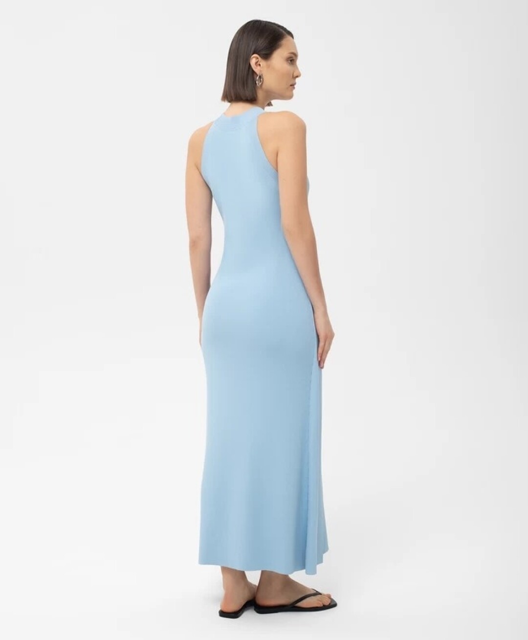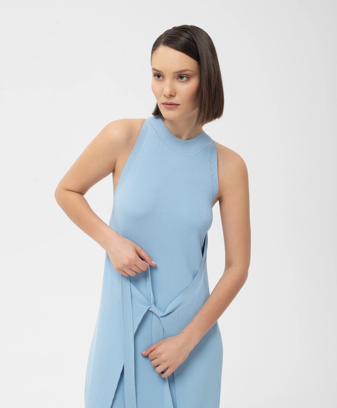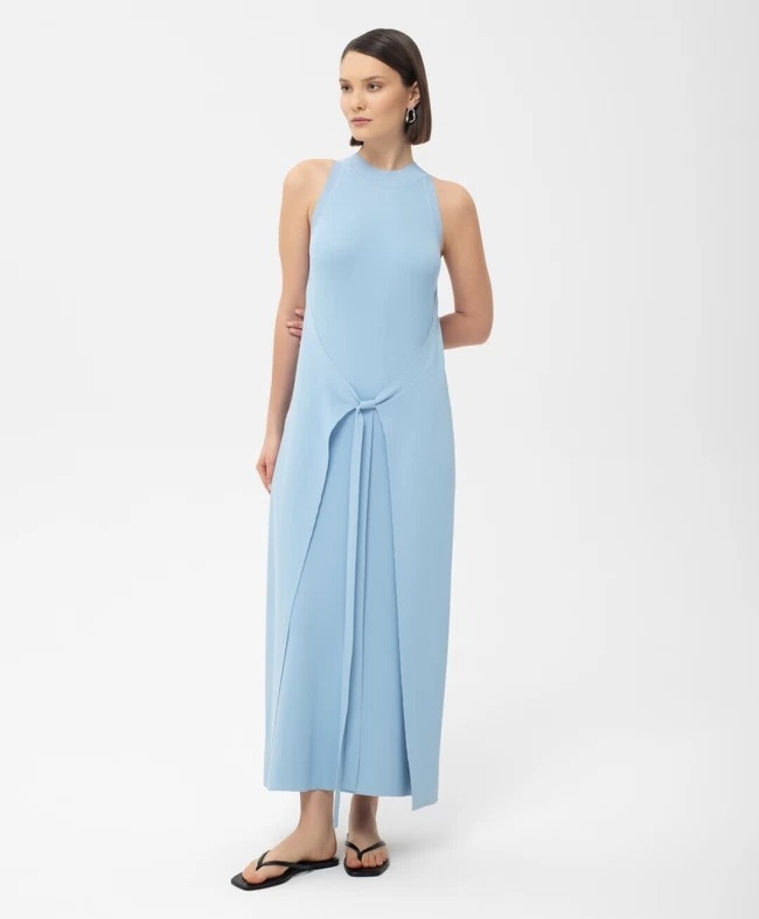 Трикотаж и имитация многослойности, помноженные на ясный бескомпромиссный голубой — это длинное платье без рукавов от Gulliver, связанное тонкой эластичной резинкой, одновременно непринужденное и с характером. Очередное прочтение тренда, когда нарочитая лаконичность оказывается не так проста, как кажется на первый взгляд: узел, который можно завязать и спереди, и сзади, оставляет простор для творчества и самовыражения.
