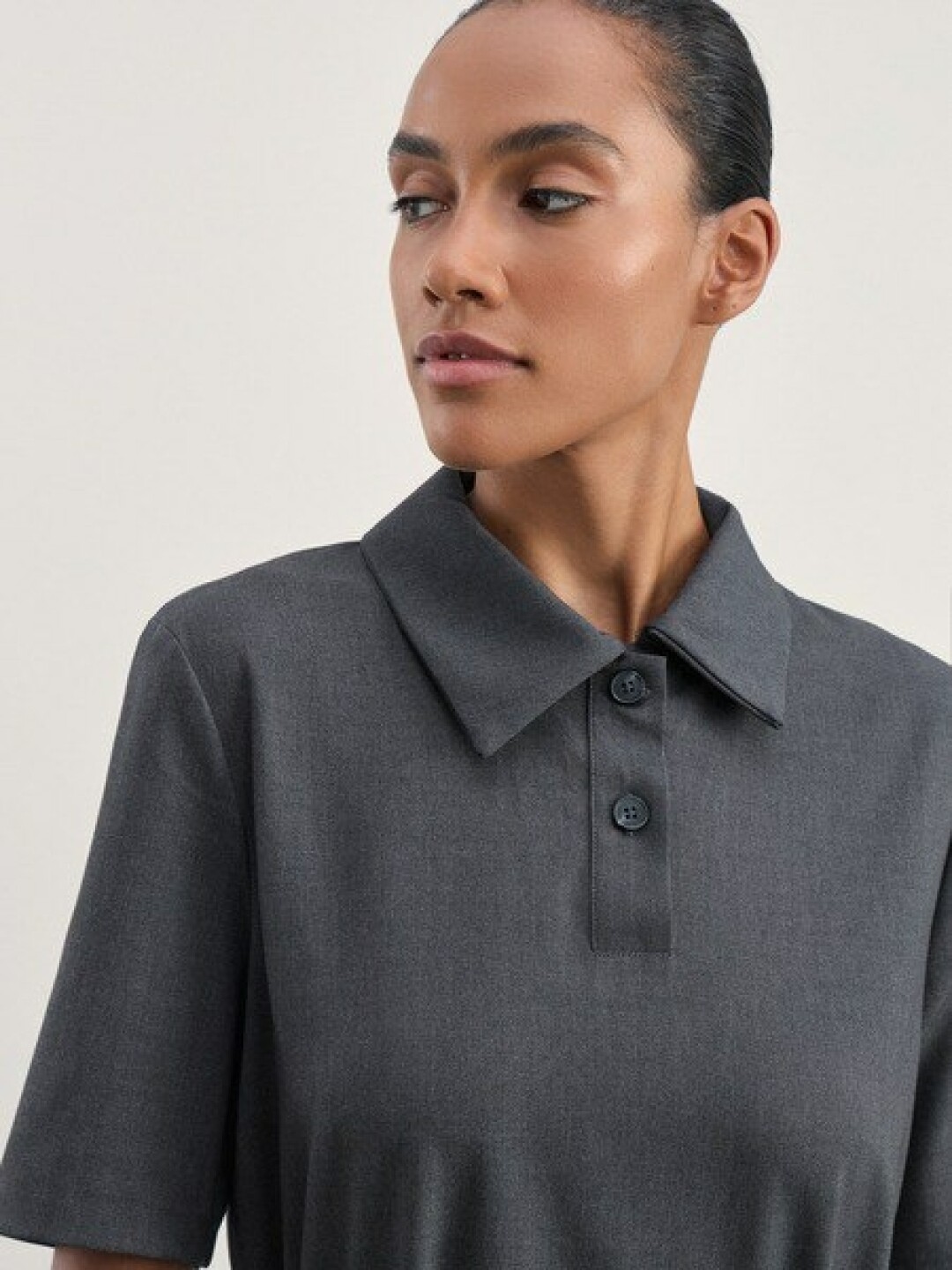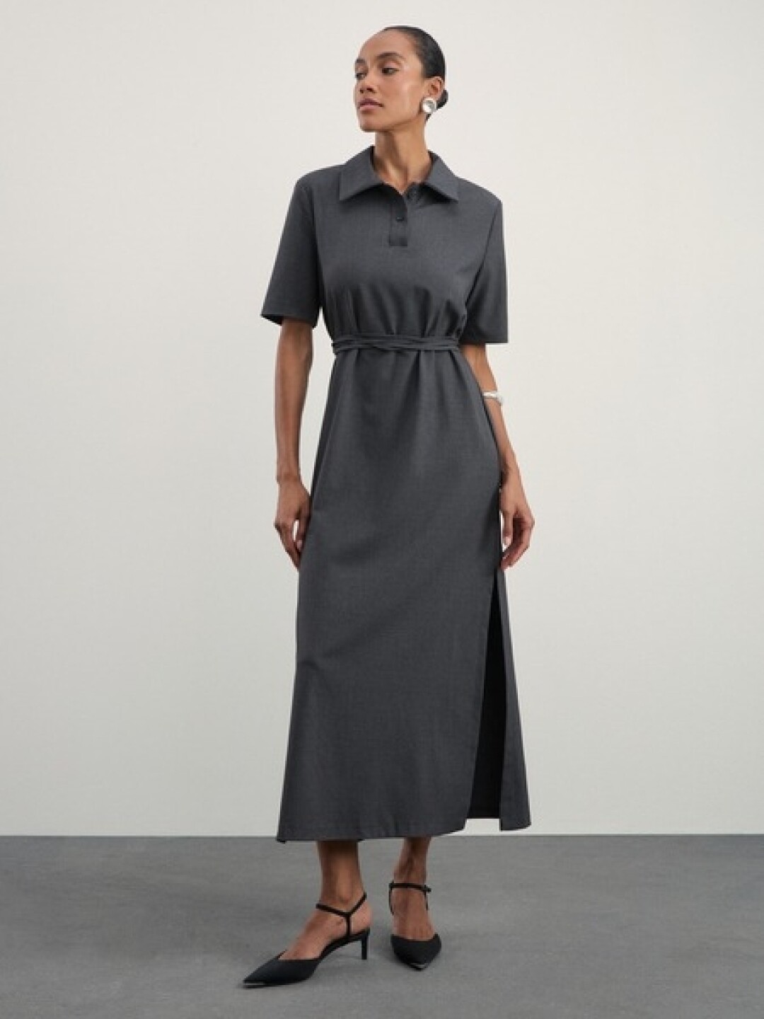 Удобная актуальная версия городского платья на каждый день — из коллекции Zarina: классическое поло отлично будет смотреться с плоским ходом и спортивной обувью, а цвет мокрого асфальта — идеальный фон для более ярких летних аксессуаров, если настроение потребует.