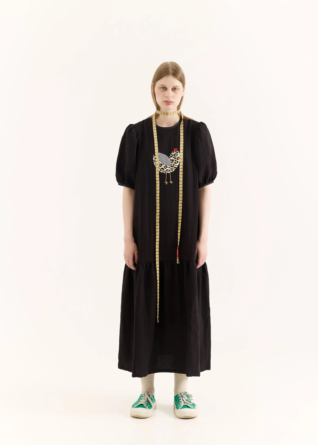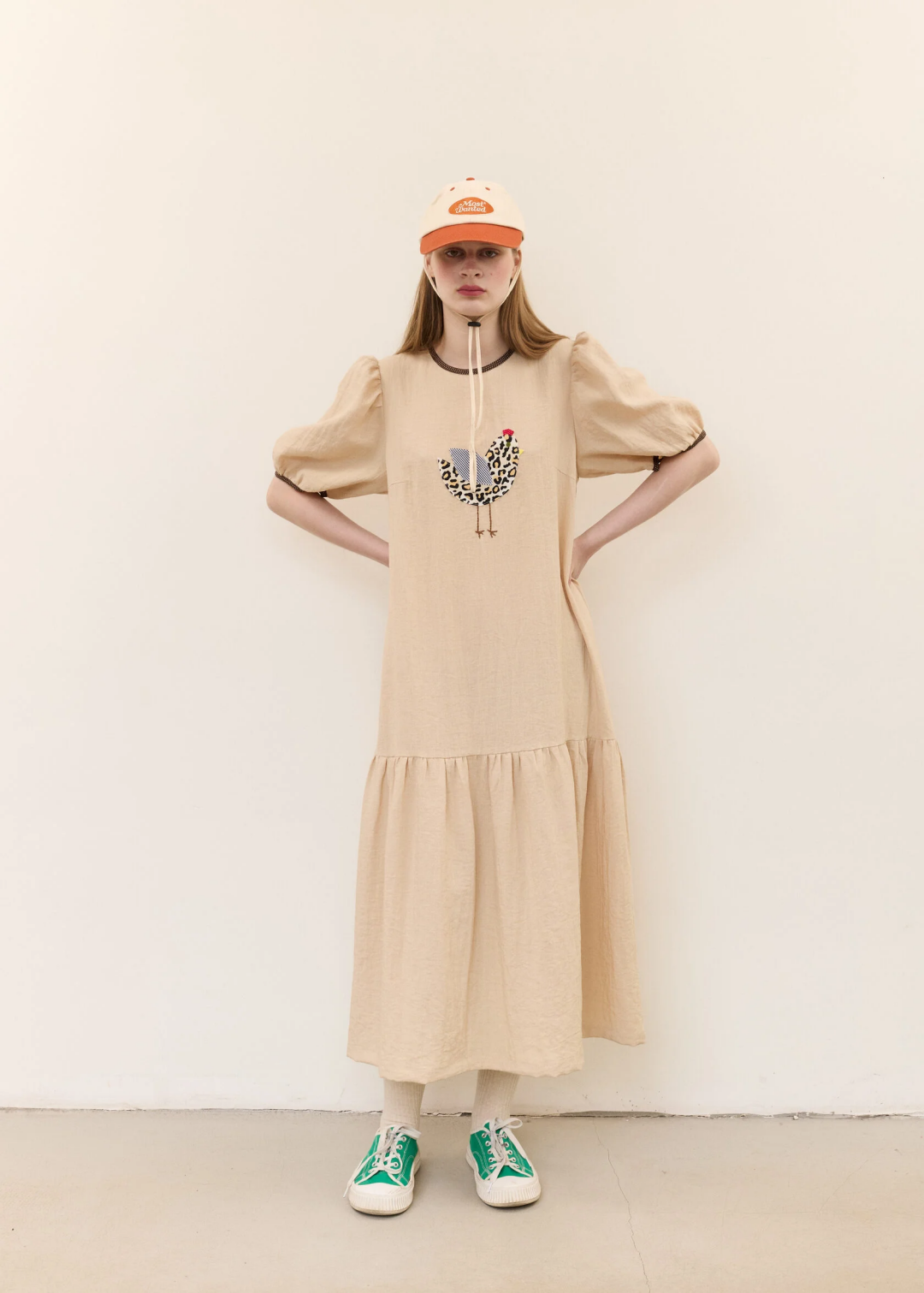 Нижегородский бренд Yаllo вовсю заигрывает с трендом на курочек: если не завести наседок, то хотя бы приручить петушка в технике пэчворк. Модель платья есть в черном и бежевом льне (а еще там 10% пэ, так что материал не так жестко мнется) и отлично стилизуется с грубой обувью, кедами и мужскими жакетами. Свободный крой поможет скрыть тайны объедания черешней, а кокетливая пуговка на спинке — плюс еще один повод пофлиртовать, если вам того захочется.