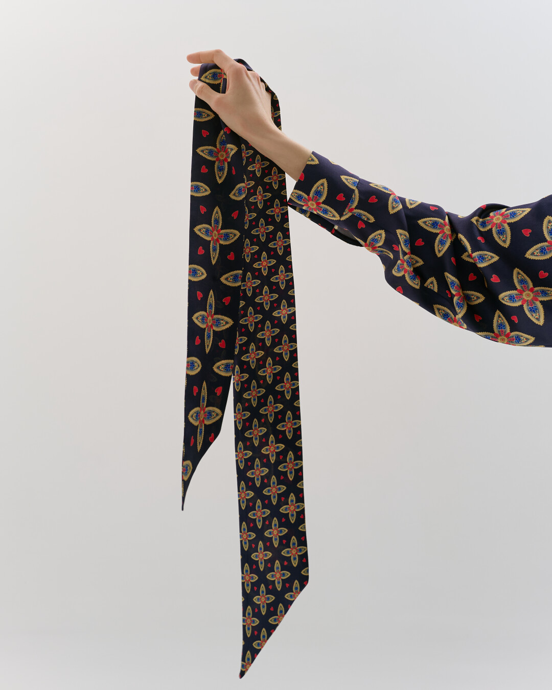 Этот аксессуар от нижегородского бренда Mashkara может быть шарфом, браслетом или лентой для волос. А может, повязать его, как пояс или украсить им сумку? 100% шелк с уникальным принтом из серии Gorky&Mashkara (аутентичный паттерн, вдохновленный мотивом обоев комнаты бабушки из Домика Каширина) везде будет уместен.