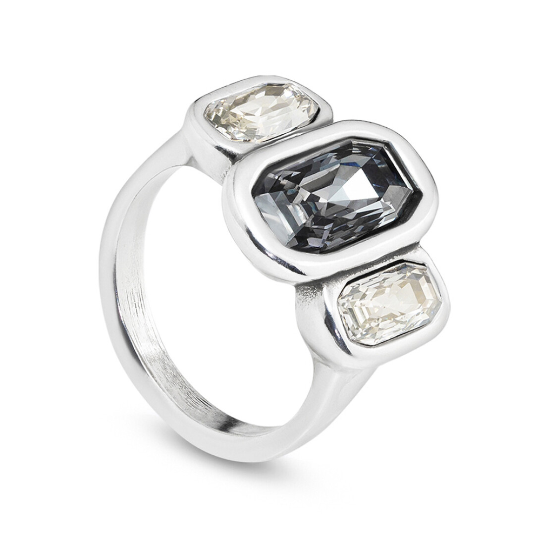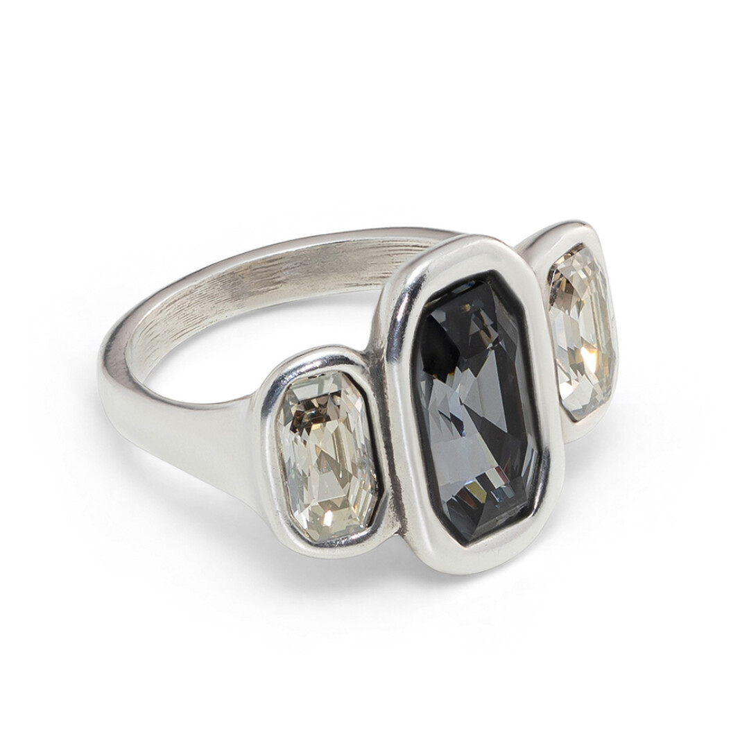 Испанский бренд UNOde50 все еще несложно найти на популярных маркетплейсах, а кольцо Asceplius из посеребренного металлического сплава с двумя прозрачными одинаковыми кристаллами и одним крупным темно-серого цвета в центре отвечает тренду на объемные и массивные украшения.