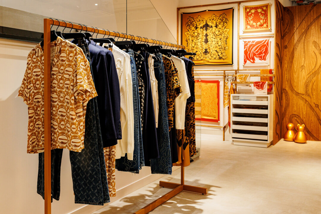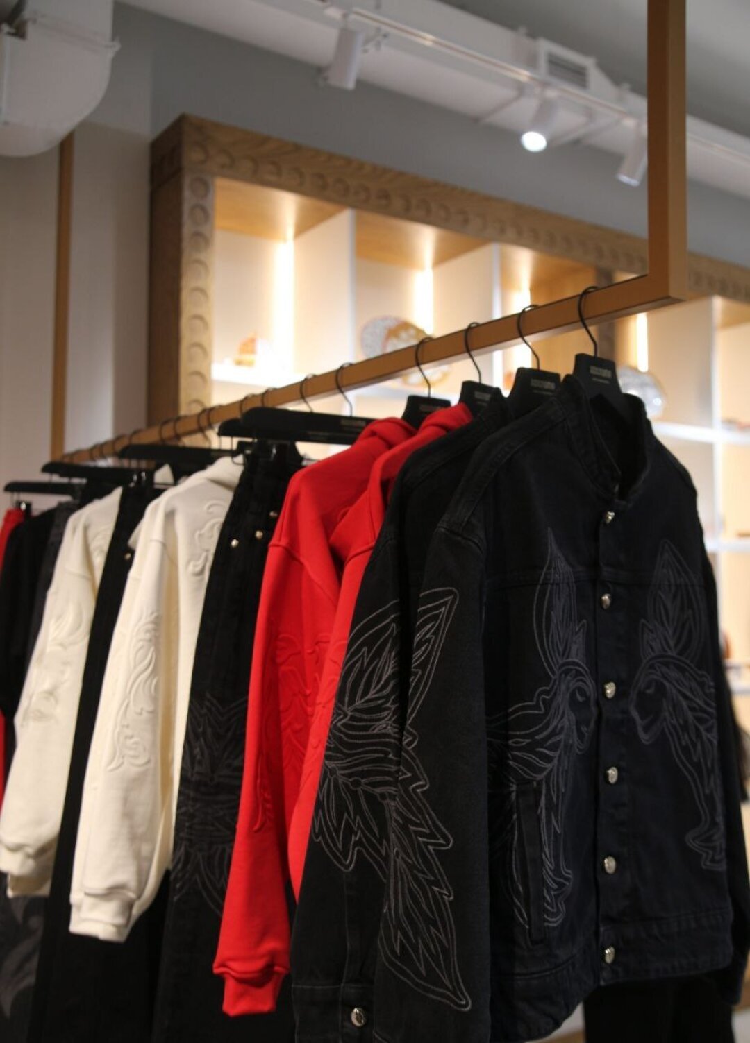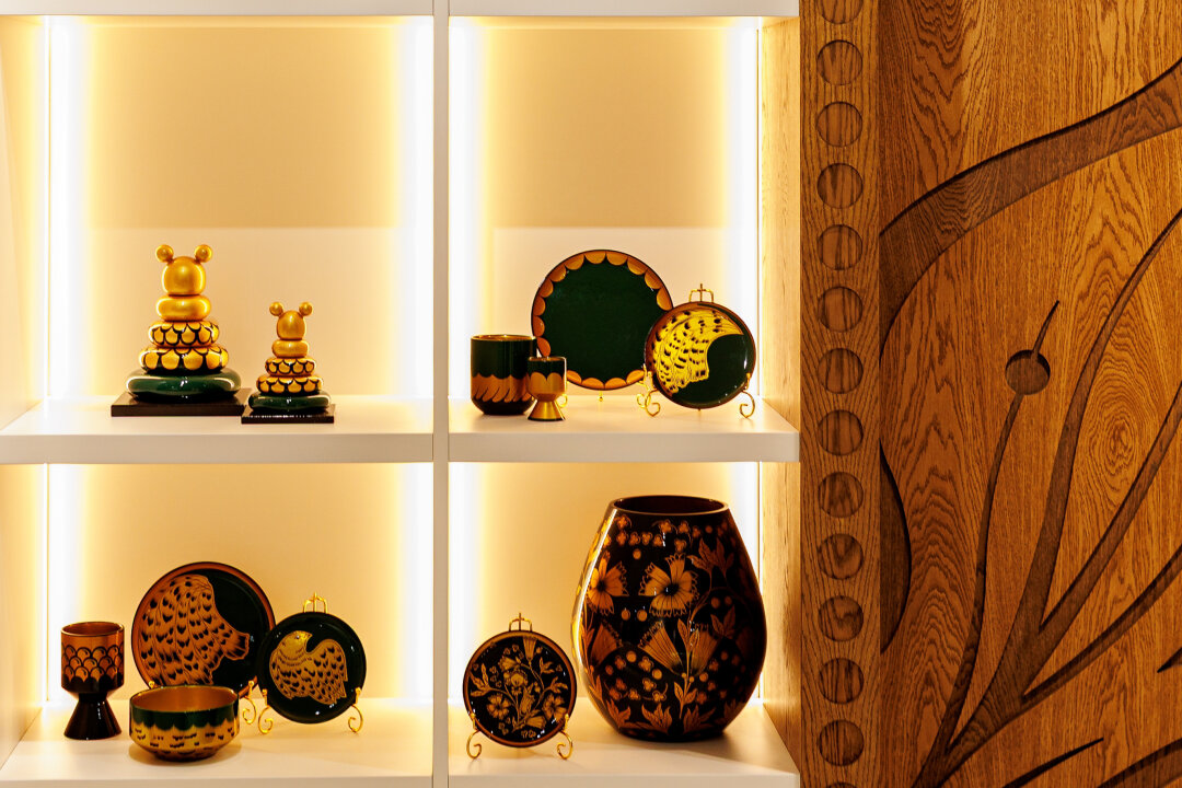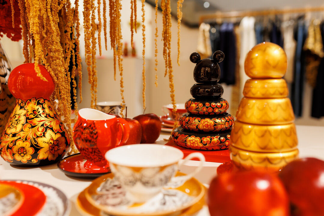 Создатели пространства совместили старинные техники с инновационными дизайнерскими решениями. Здесь и современная продукция бренда «Хохлома»: коллекция одежды, аксессуаров, предметов интерьера и посуды — фарфора и деревянной утвари (ее создавали в сотрудничестве с известным дизайнером Аленой Ахмадуллиной), и выставка «Золото за Волгой. 10 историй о хохломе».