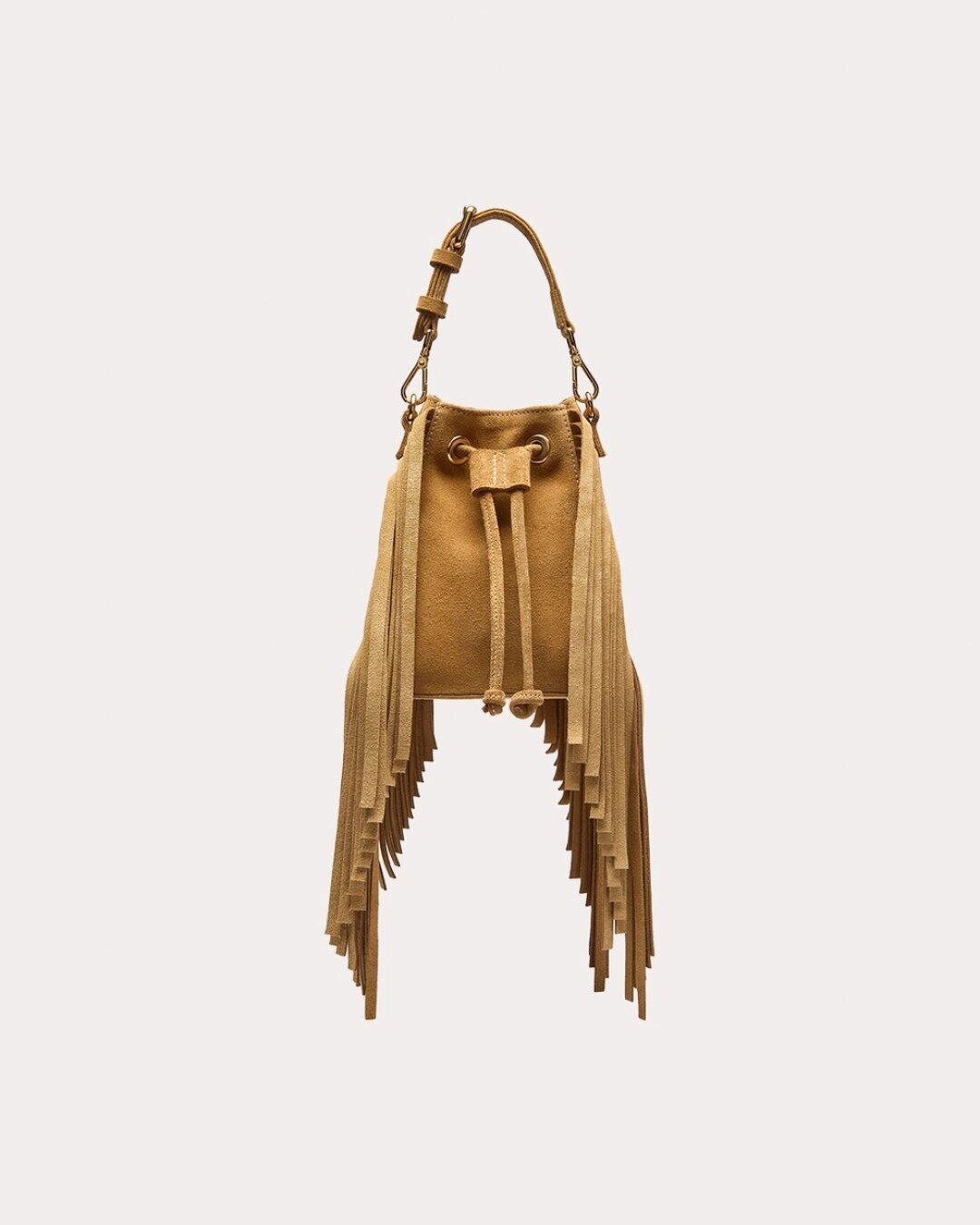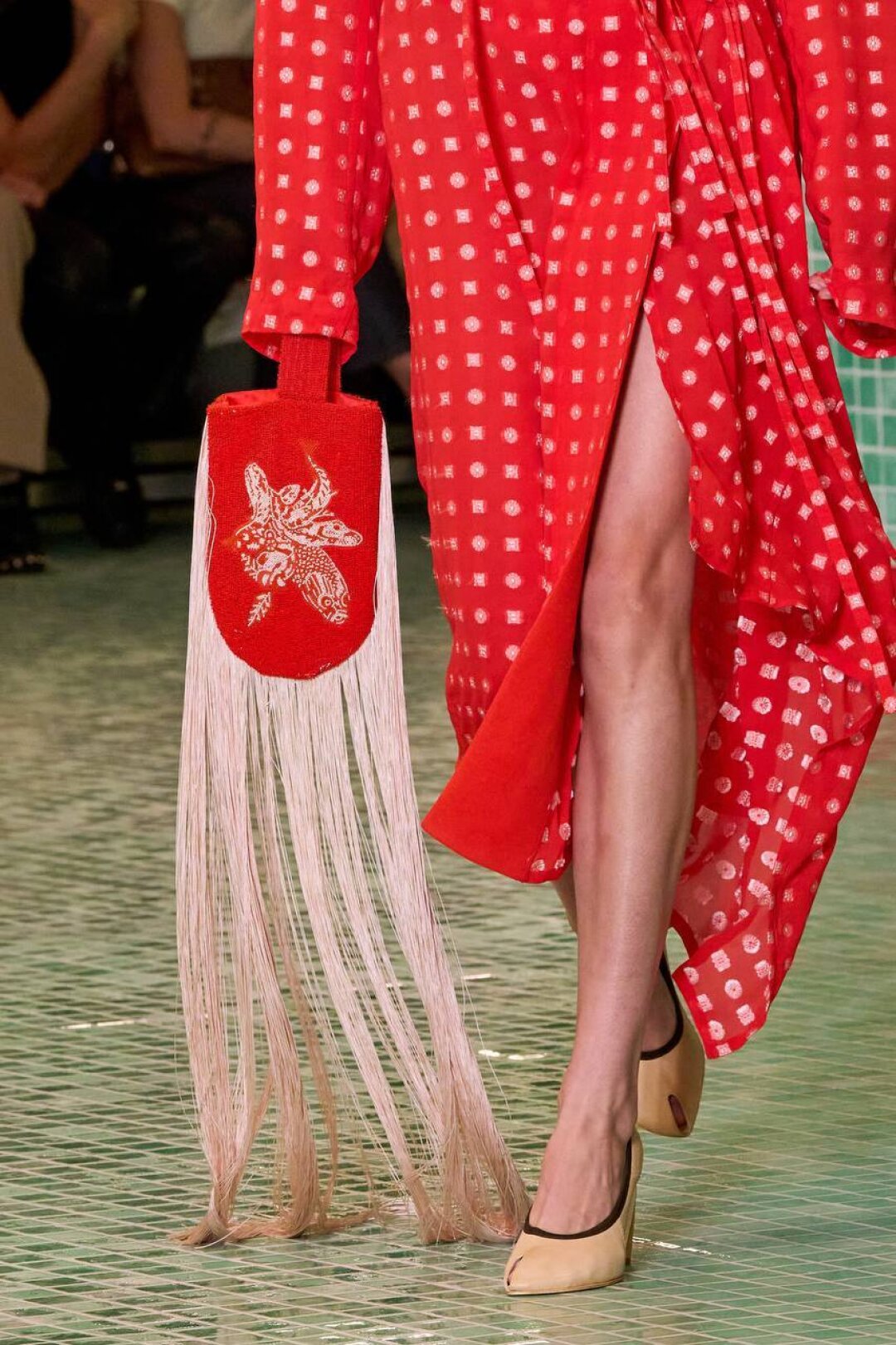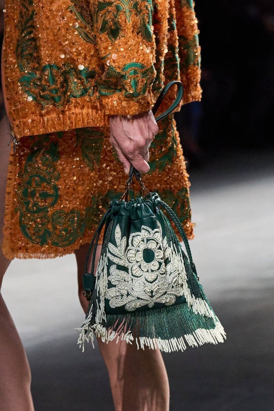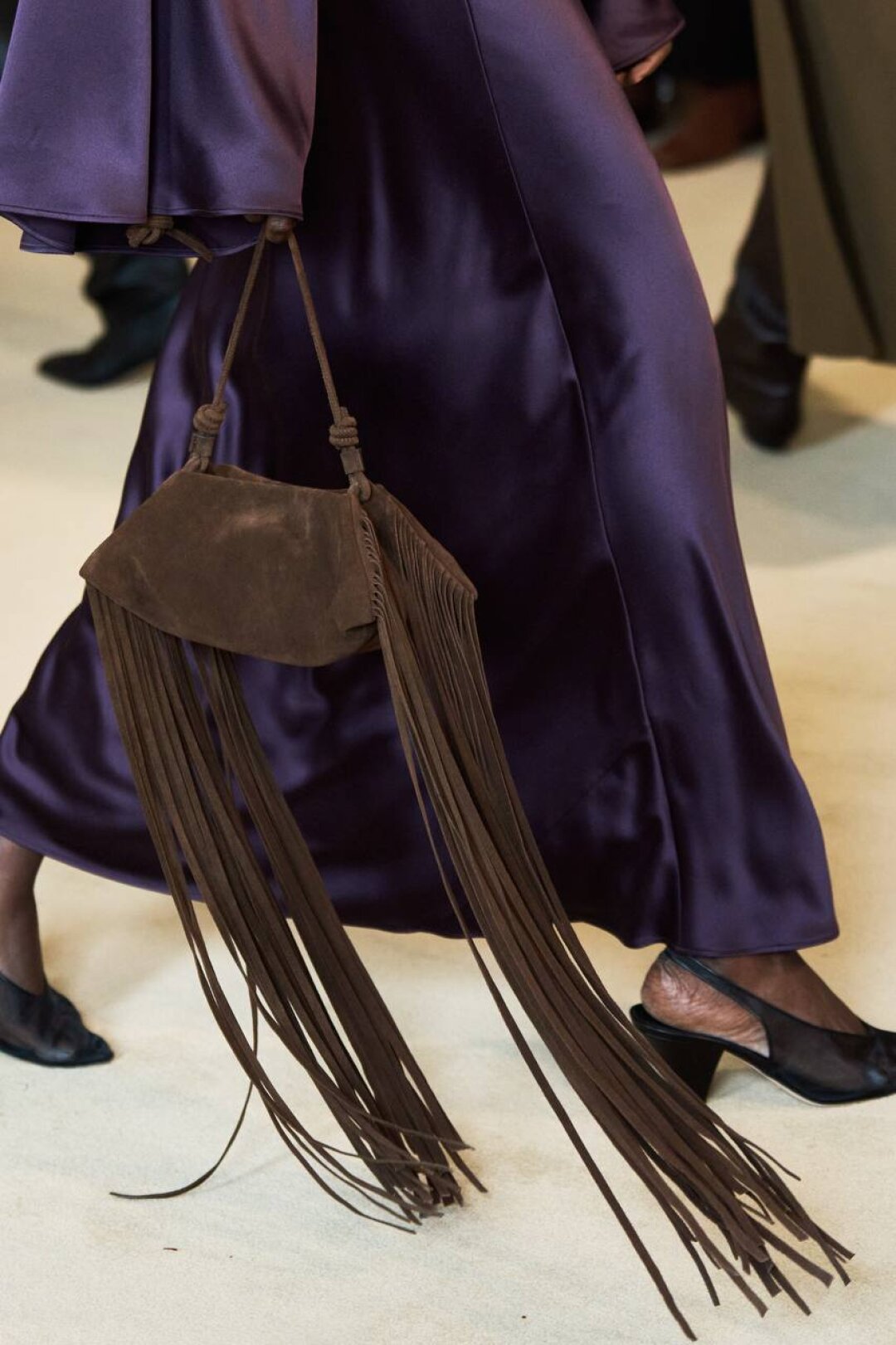 Бохо-шик набирает силу (главная эстетика лета!) и шелестит бисерной бахромой Etro и шелковой Tory Burch (на шинуазри-мешочке с вышитыми карпами кои!). В Valentino и Isabel Marant отрабатывают сразу два тренда — украшают хобо не только бахромой, но и гранд-заклепками. А Джозеф Альтузарра превращает хиппи-аксессуар в вечерний айтем при помощи атласного макси глубокого баклажанового оттенка.
