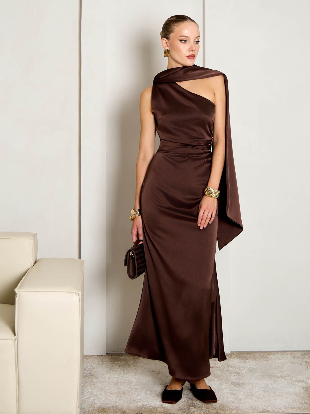 Совсем уже взрослая: атласное платье-макси LICHI — достойный ответ «нарядам принцесс» и воплощение современной праздничной эстетики. Шоколадный оттенок и струящаяся атласная ткань — залог актуального лука образа в 2025 году. Отлично подойдет не только для выпускного, но и особого свидания (теперь — можно!)
