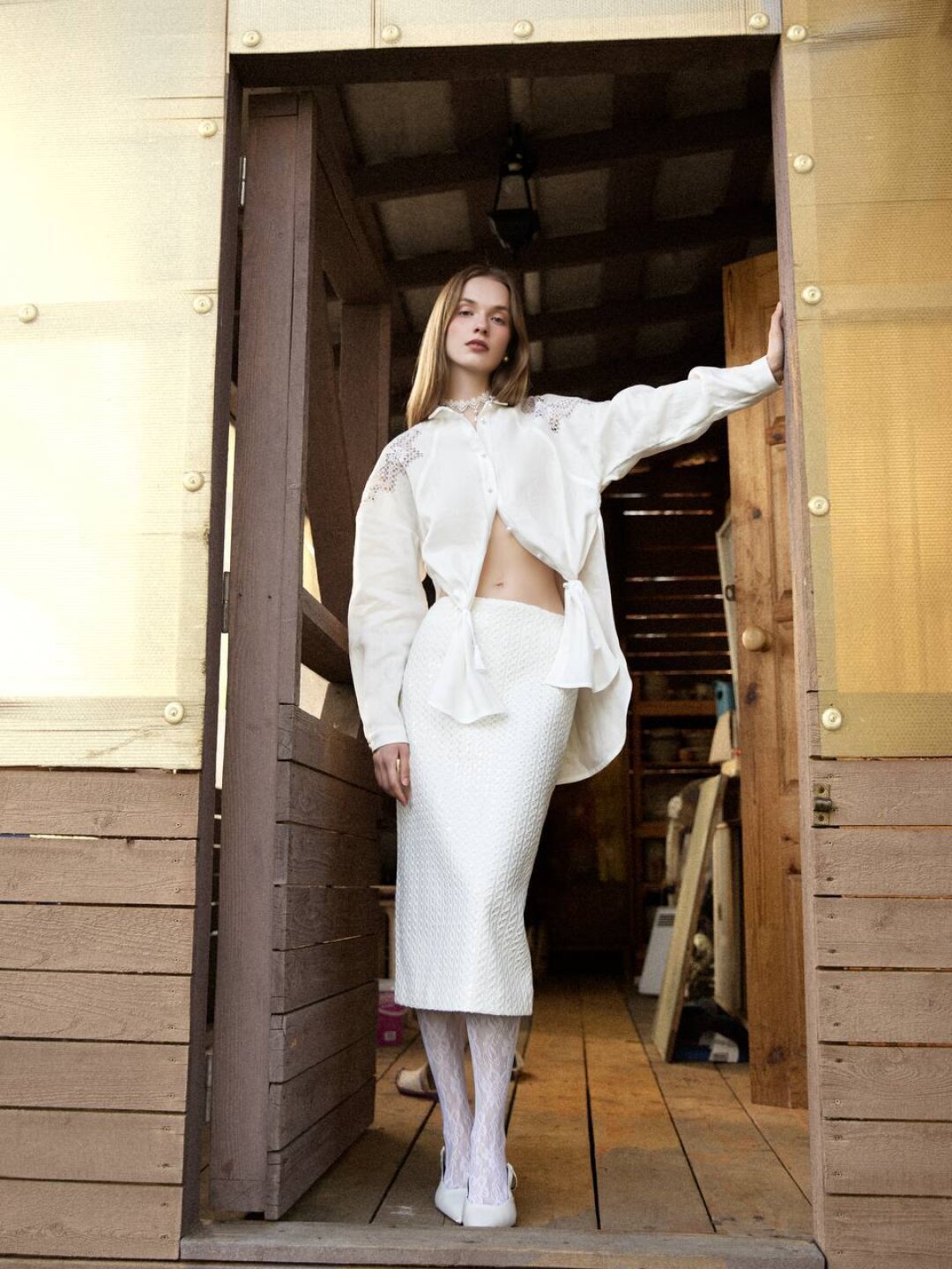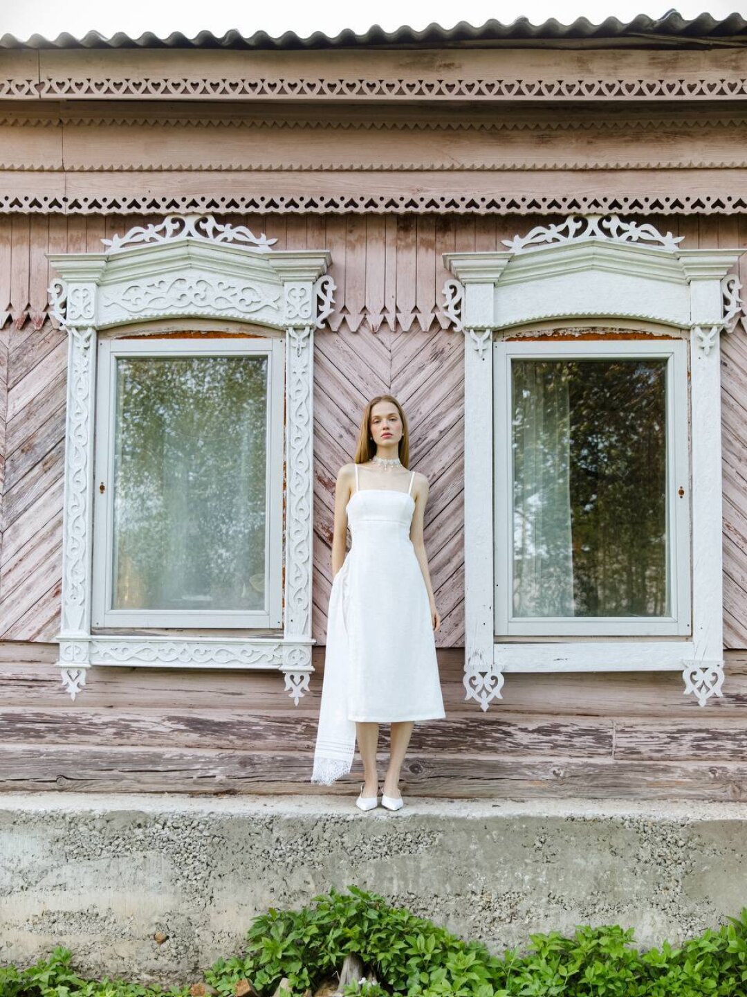 Среди центральных «незримых лейтмотивов» коллекции – узоры наличников и работы Кустодиева («как символа русской патриархальной купеческой России и ее праздничной атмосферы»). Полина рассказала нам, что не стала менять технологии и традиционный орнамент – из-за этого цикл производства (всё создают в Нижнем!) пришлось увеличить. Но и эксперименты имели место – с длиной, кроем и прозрачностью.
