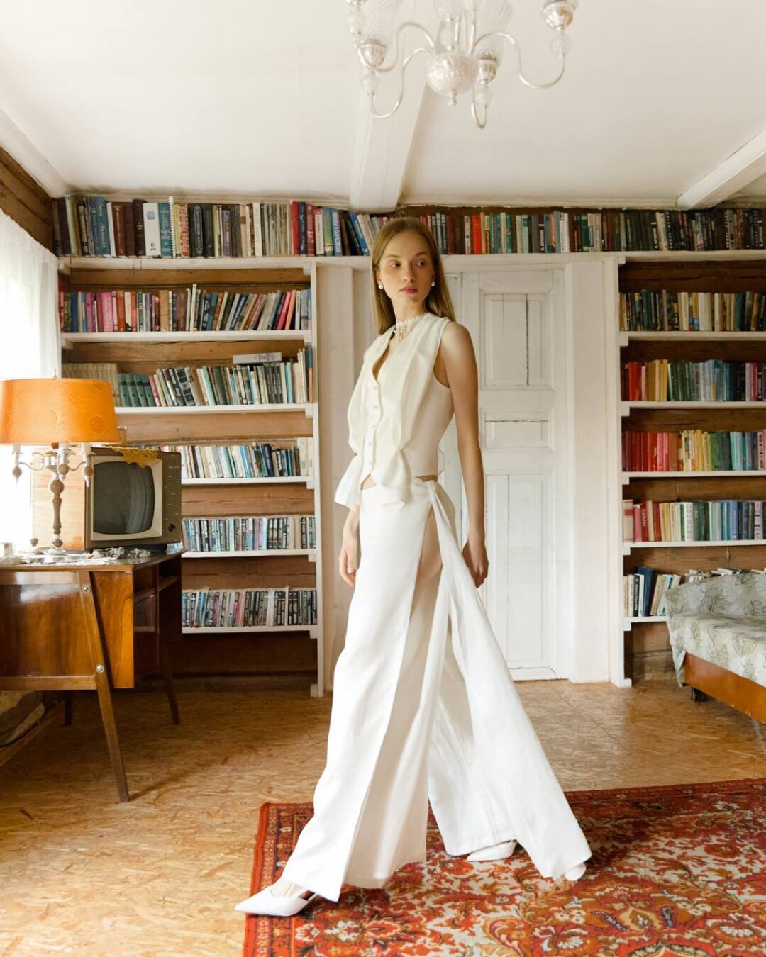 Получился белоснежный дроп с юбками изо льна и шитья (и драпировками «занавеской»), платьем с бочками и не только. Среди главных элементов – русский подзор, кружевная лента-дорожка от «Чкаловского гипюра».