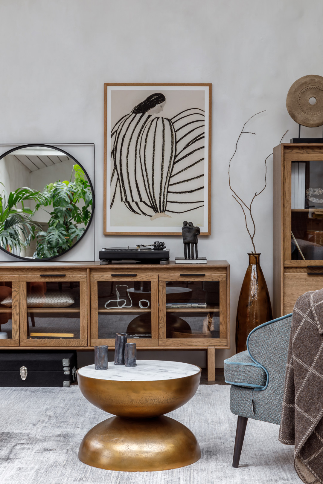 Поможет в этом витрина со стеклянными дверцами из коллекции City. Эта линейка мебели, созданная в коллаборации с британским дизайнером Джеймсом Паттерсоном, уже давно стала бестселлером. Широкая витрина City с двумя стеклянными фасадами – это верх лаконичной роскоши, воплощенной в сочетании темного дуба и латунной фурнитуры. Благодаря тонким, идеально выверенным ножкам создается впечатление, что изделие будто бы парит над полом.