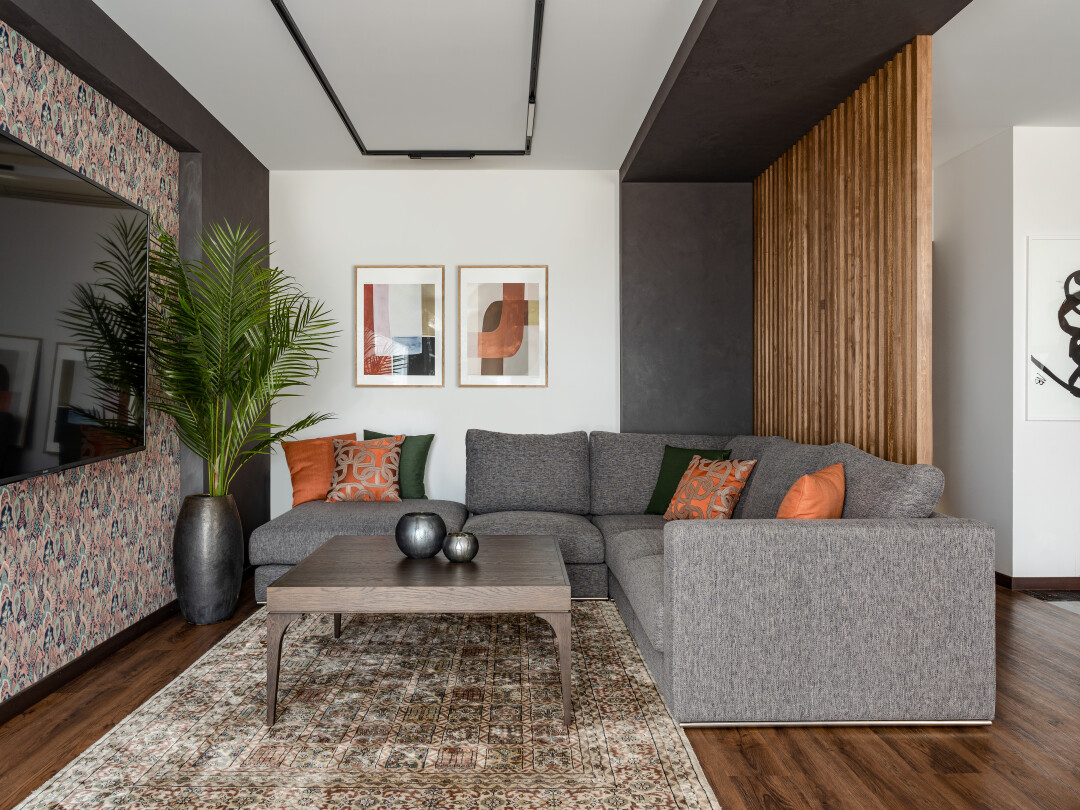 Когда мы путешествовали по Индии, в Дели по совету нашего друга отправились на рынок, где продают суперэксклюзивные шелковые ковры. Выбрали, купили и повезли домой – огромный, тяжелый, но очень красивый и ценный. В новом доме вся концепция ремонта крутилась во- круг него: сначала был ковер, а потом все остальное.