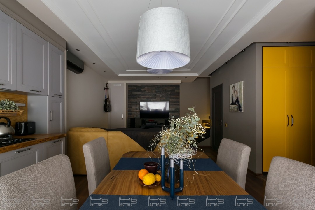 Гостиная совмещена с кухней. Нейтральная серо-бежевая гамма приятно контрастирует с темным добротным паркетом и псевдо-кирпичной стеной. Сочный желтый создает приятную теплую атмосферу. При том яркий его тон в обивке дивана и фасадах шкафа прихожей гармонично перекликается с деревом медового оттенка в столешнице и фартуке кухни и логично переходит в благородный обеденный стол. Тема дерева эффектно продолжается в санузле, усиливая атмосферу домашнего тепла или даже теплого уюта загородного дома. Спальни нейтральны по цвету, что способствует расслаблению и хорошему сну. Акценты лишь в темном, насыщенно синем текстиле в одной комнате и изящном темном потолке с классической гипсовой розетке - в другой. В текстиле на окнах - минимализм, что дарит пространству ощущения легкости, воздушности и позволяет естественному свету беспрепятственно гулять по дому. Глубокий зеленый холл перекликается с природной палитрой гостиной. Кстати, и стены и пол в холе такого цвета не просто так, а для того чтобы скрыть низкий потолок. И на практике этот прием прекрасно работает. Границы стерты, и потолок как будто не заметно совсем, а того, что он недостаточно высок, и подавно. И все это пространство прекрасно объединяет «золотая» лестница , которая , конечно, совсем не золотая. Просто теплая подсветка ступеней создает такой эффект.