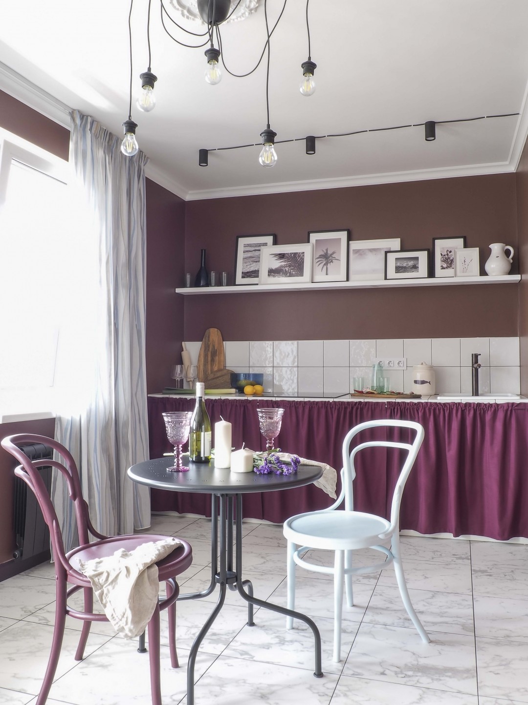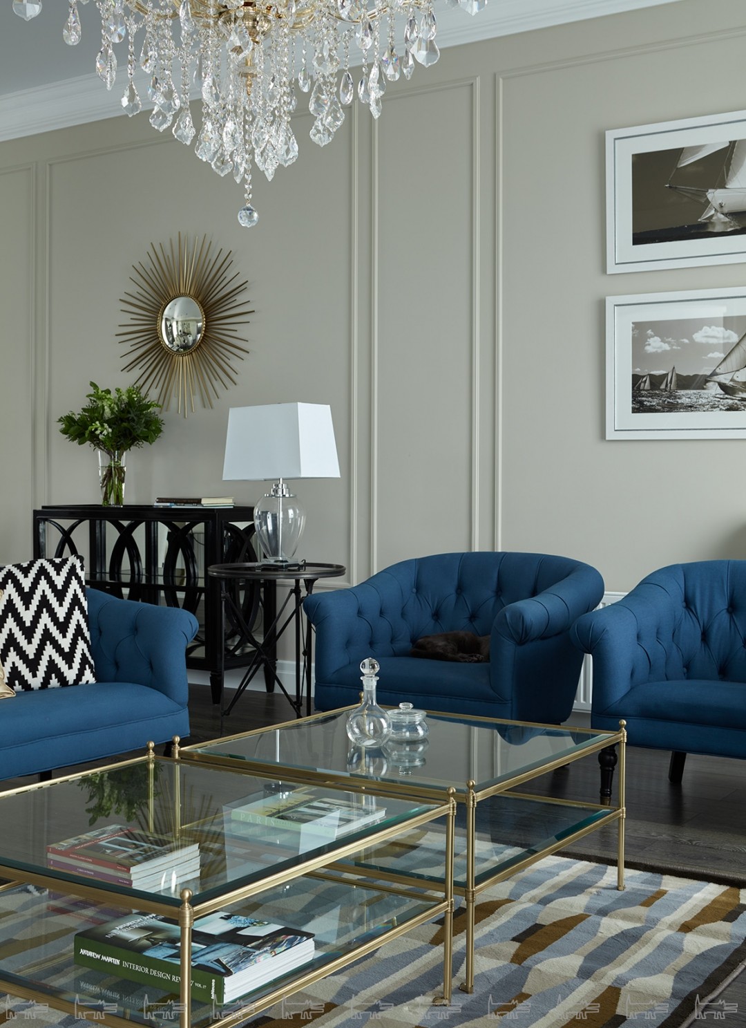 В основе проекта - однокомнатная квартира стандартной планировки, которую дизайнеры превратили в модные апартаменты с небанальным зонированием: гостиной с камином, кухню в стиле маленьких парижских кафе и спальню, отделенную от остального пространства портьерами. Цветовая гамма оформления выполнена в синих и терракотовых оттенков, отчего создается ощущение, что квартира наполнена светом. "Парижское кафе" на кухне вышло эффектным, но не перегруженным. Яркие стены и открытые полки наполнили место воздухом, а шторы из французской ткани, антикварные стулья, самодельная «лофтовая» люстра и винтажная плитка придали кухне особый французский шик. Смысловым центром зоны стал маленький круглый столик – неотъемлемый атрибут традиционного парижского кафе, где можно часами вести беседы с друзьями за бокалом.