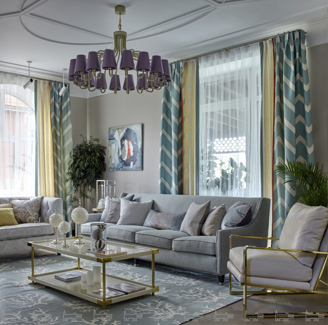 Интерьер загородного дома для молодой семьи в стиле современной классики основывался на пожеланиях владельцев, одинаково тяготеющих к традициям, экспериментам и авторскому видению. Дизайнеры сделали ставку на сочетание классических решений, арта и ретро, что в результате создало микс стилей и своеобразное смешение культур в одном флаконе. Здесь совершенно классическая люстра смотрится уместно рядом со шторами из тканей шестидесятых годов и другой мебелью, стилизованной под ретро. При этом в интерьер гармонично вписались самобытные предметы скандинавского дизайна, что образует игру контрастов: черного и пастельных оттенков.