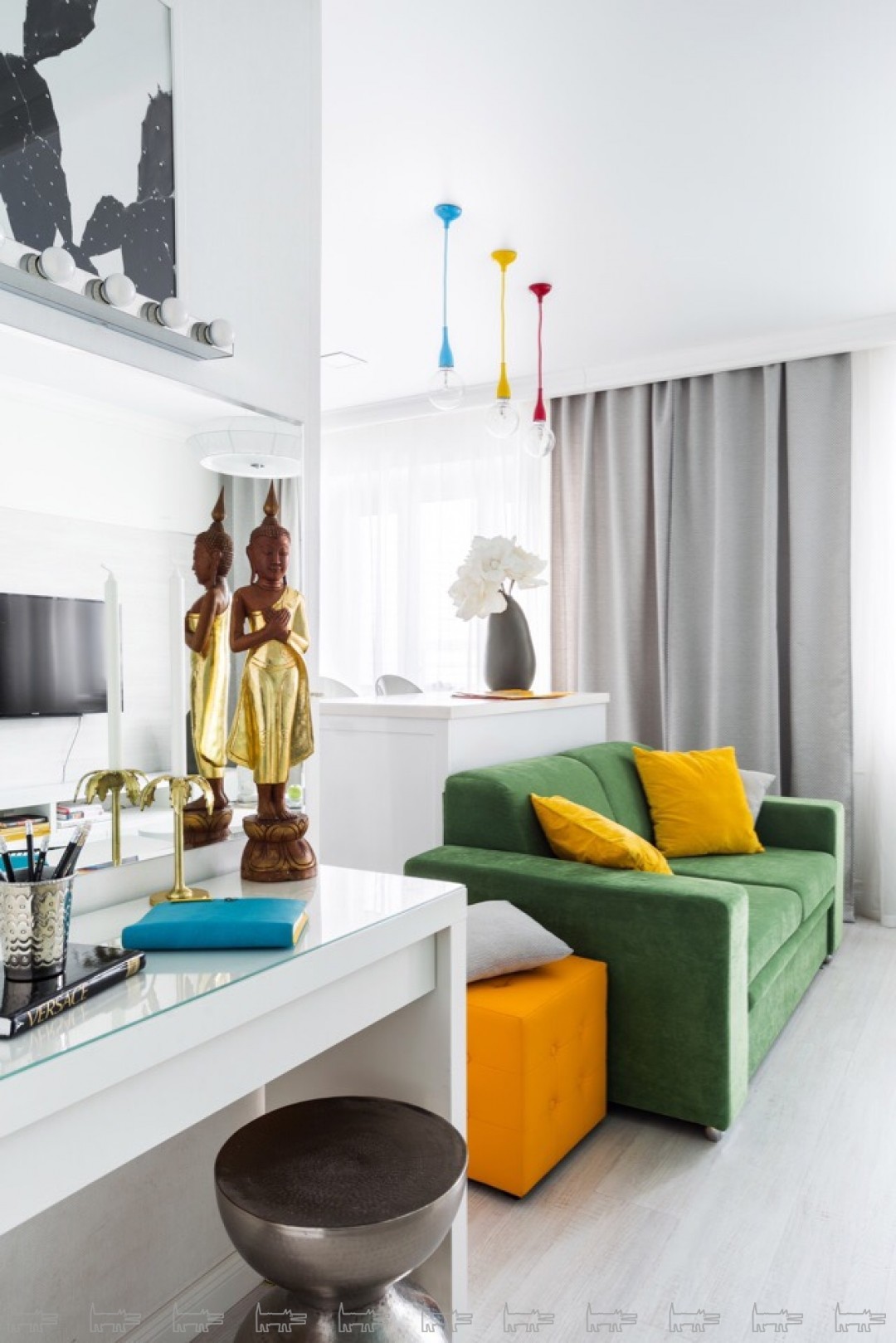 «Парижанка» - квартира для девушки, которая любит путешествовать, мало времени проводит дома, много работает, любит цветы и музыку. Достаточно небольшая площадь (32 кв. метра) позволила уместить все, что нужно для жизни: двуспальную кровать, диван, просторную кухню с баром и рабочий стол. Все дело в светлом фоне, ярких акцентах, стеклах и зеркалах, которые создают ощущение радости и уюта в любую погоду.