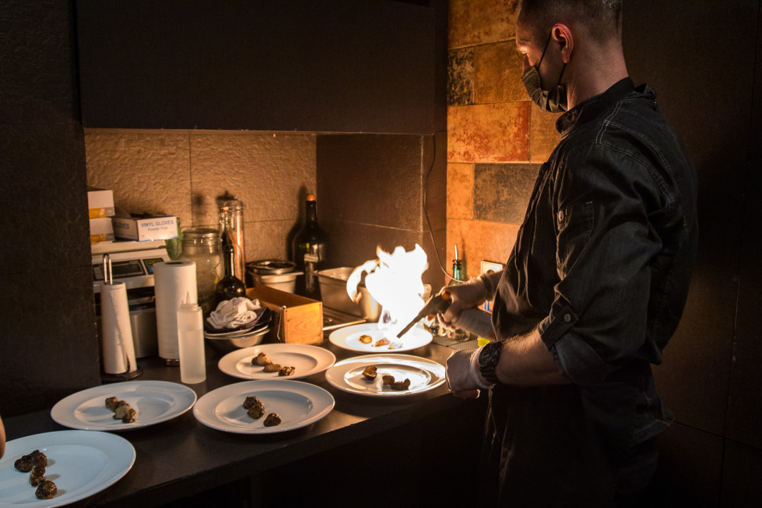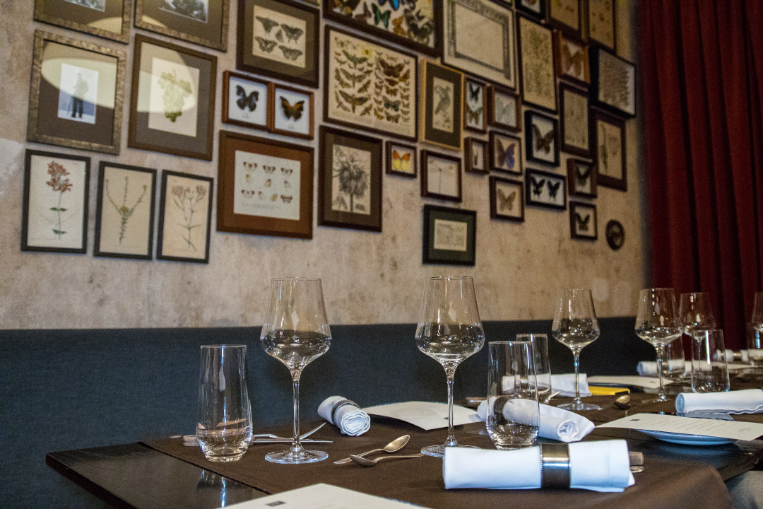Расположен он в старой петербургской квартире в историческом центре на набережной Мойки. Открытая кухня с медной посудой на стенах, чугунной печью AGA больше напоминает мини-театр. Меню ужина уже сформировано, надо только выбрать, решитесь ли вы на три блюда или на полный вариант из семи перемен. Для примера – лишь название десерта «Грибной крем-брюле с замороженным глинтвейном». Вот и думайте!