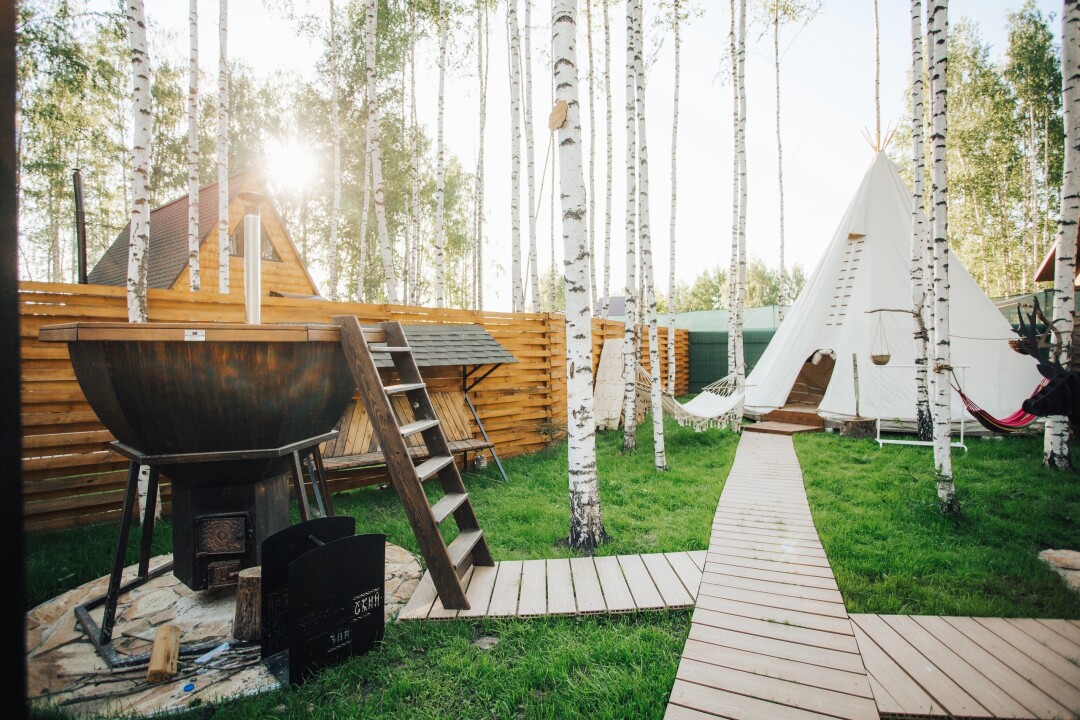 Тут все и началось. Отель запустил тренд на лесной отдых со всеми удобствами, и «всеми» вообще не преувеличение. Предлагается: отдельный шатер в стиле бохо (шамаханским царицам и царям) с возможностью заказать завтрак на ложе, а потом неспешно прогуляться на катере по тихому озеру или попариться в кедровой бане. У места авторитетные трэвел-награды и большая фанбаза.