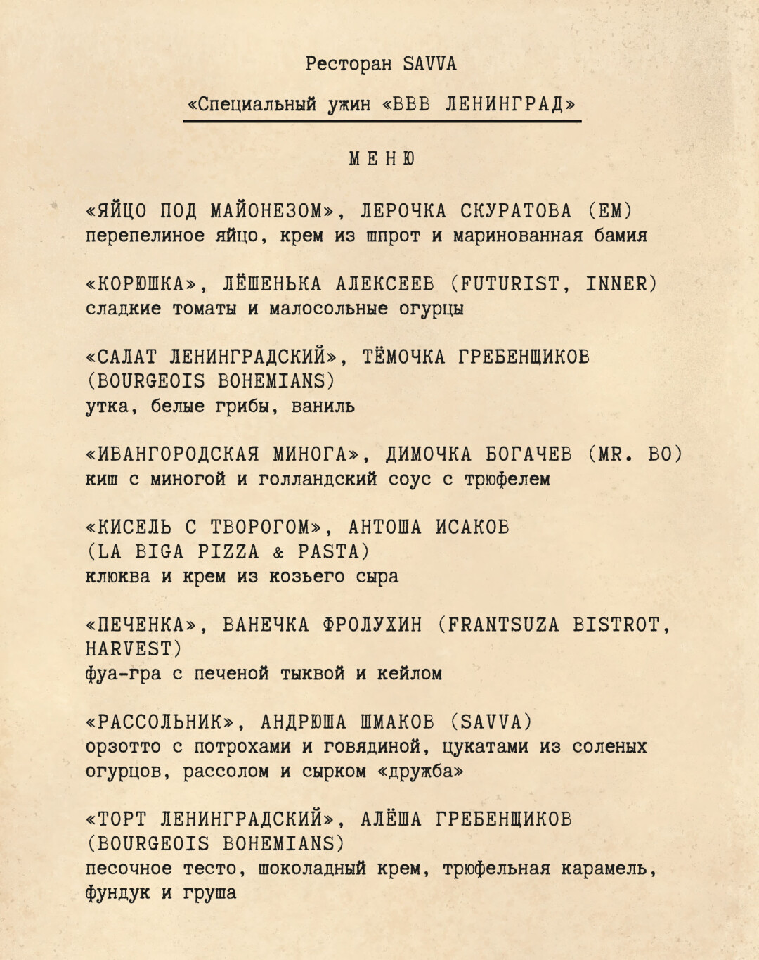 Ужин по мотивам легендарных гастрохитов Петербурга пройдет в московском ресторане Savva. Его шеф Андрей Шмаков собирает своих знаменитых друзей из Северной столицы. В 16 рук они приготовят блюда, вдохновленные ретро-эстетикой города на Неве и детскими воспоминаниями. 27 февраля: 8 шефов на одной кухне, 8 авторских подач и 8 личных историй.