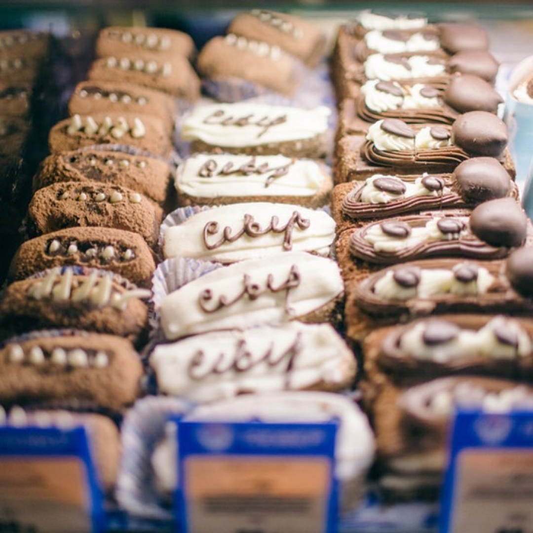 На миндальные печеньки из сети старинных кондитерских «Север» меня подсадила жена Татьяна: сладкое я не очень люблю, но теперь не уезжаю с Московского вокзала без этих коржиков с тертым миндалем. Если правильно хранить, они довольно долго остаются свежими. А вот всеобщей любви к пышечной на Большой Конюшенной я не разделяю: там всегда здорово неопрятно — ее советскость давно пора привести в формат аттракциона.