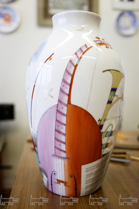Первое время на заводе мучительно искал свою тему. Однажды расписал чашку и вдруг понял – это мое: стал развивать созданный рисунок, так появилась серия фантазийных музыкальных инструментов. Фарфор ведь и сам по себе материал очень музыкальный. С помощью инструментов я начал создавать мелодии на фарфоре.