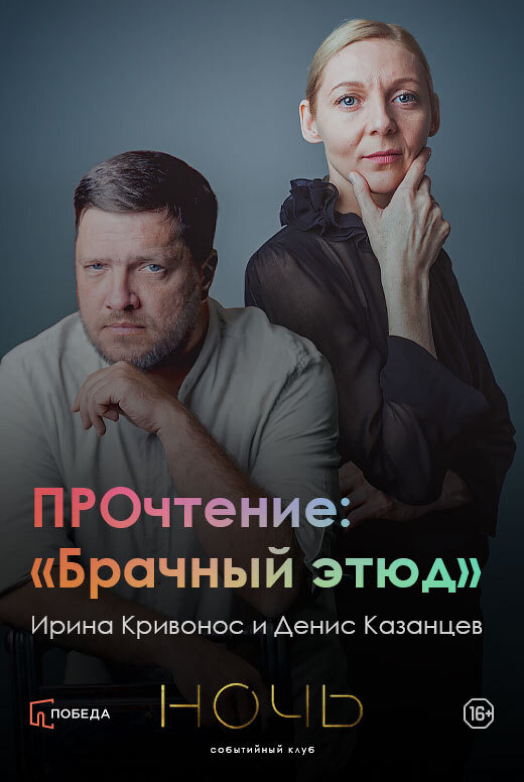 В тёплый летний вечер сцена клуба «Ночь» превратится в пространство для тонкого психологического дуэта. Актёры Денис Казанцев и Ирина Кривонос представят пьесу «Брачный этюд» классика американской драматургии Эдварда Олби.