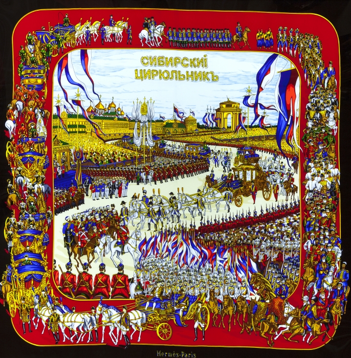 В названии каре «Grand cortege a Moscou» («Большой парад в Москве») 1992 года читается привязка к России. Вдохновением для автора Мишеля Дюшен стала работа русского художника-передвижника Константина Аполлоновича Савицкого «Парадный въезд в Москву Государя Императора Александра III в день его коронации 27 мая 1883 года». Не менее значимым был и повод для перевыпуска платка через шесть лет — предпремьерный показ фильма Никиты Михалкова «Сибирский Цирюльник», специальные гости которого получили подарок, ставший со временем коллекционной ценностью.