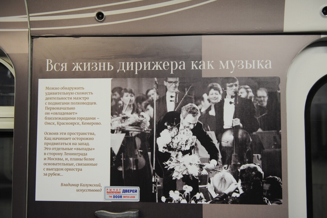 На станции «Площадь Гарина-Михайловского» Новосибирского метрополитена состоялась презентация нового тематического вагона поезда. Экспозиция «Вся жизнь дирижера как музыка» посвящена 100-летию со дня рождения выдающегося дирижера и создателя Новосибирского академического симфонического оркестра Арнольда Каца.