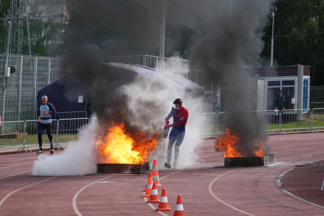 Кубок Федерации пожарно-спасательного спорта стартовал с соревнований в пожарной эстафете. В ней на первом этапе участники по лестнице забегают на небольшое строение высотой 2,5 метра, бегут по крыше, затем спрыгивают с неё. На втором этапе атлет по ходу забега преодолевает двухметровый забор. На третьем этапе спортсмен пробегает по сходням, разматывает пожарные рукава и присоединяет их к крану. На четвёртом этапе участник подхватывает огнетушитель и тушит огонь.