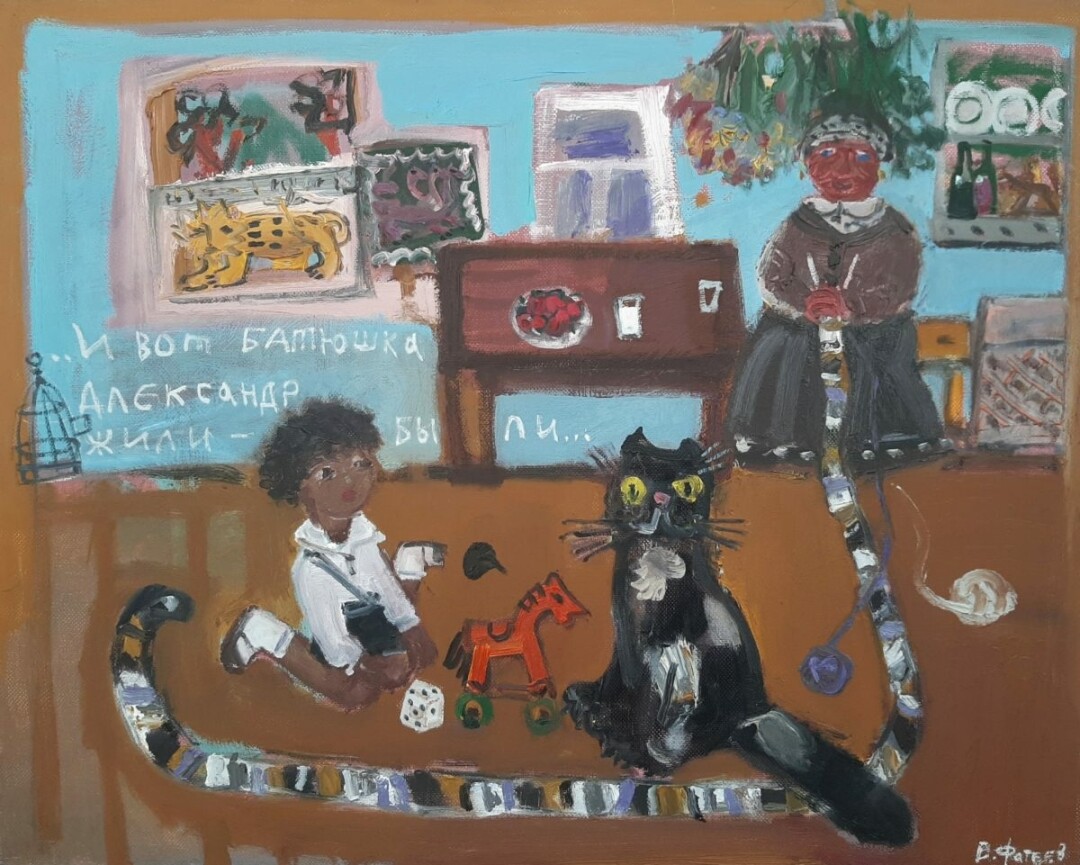Пушкин у Фатеева изображён с теплотой, иронией и любовью: то он наивный и задумчивый ребёнок («Пушкин. Детство»), то мечтательный сибарит («Пушкин и Муза»). Кажется, Владимир Афанасьевич рассказывает историю человека, которого неплохо знает. Со свойственными ему искренностью, открытостью художник приглашает и нас стать частью этой истории – прогуляться по улицам Санкт-Петербурга в компании классиков: А. Пушкина и Н. Гоголя.