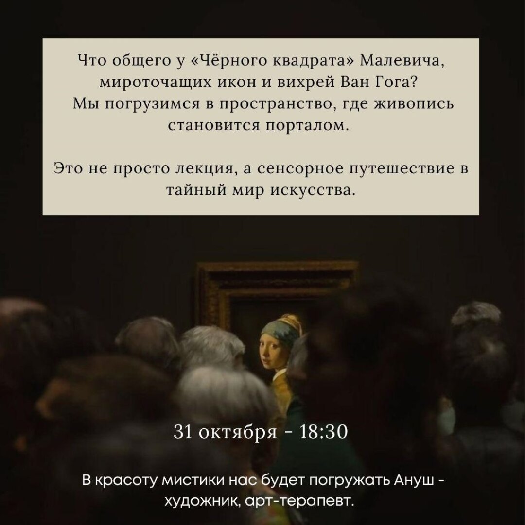 31 октября ы Новосибирске состоится лекция «Мистика и тайны живописи» — новое событие в серии камерных арт-вечеров, организованных проектом интеллектуальных встреч о культуре и искусстве.
