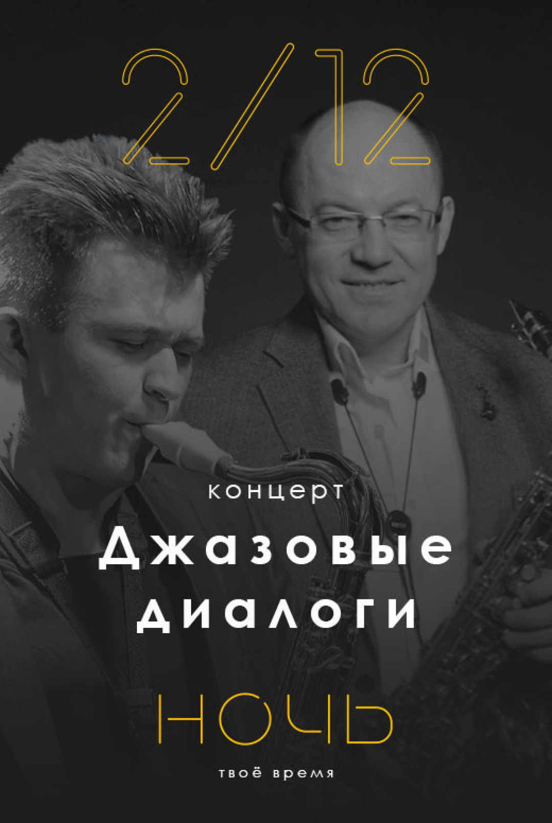 Уникальная музыкальная программа для всех поклонников джаза, в которой на сцене встречаются сразу два саксофона. Вас ожидает волшебная атмосфера, феерический видеоряд, изысканная кухня и лучшие джазовые музыканты: Андрей Турыгин (саксофон), Евгений Ранг (саксофон), Михаил Муравьев (контрабас), Андрей Ильин (ударные) и Денис Никитин (рояль).