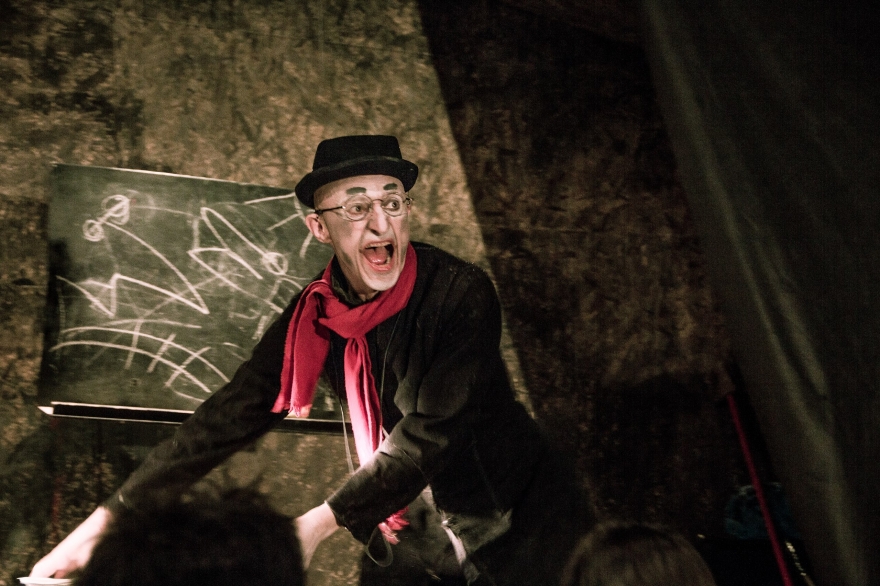 Зрители садятся не на сидения, а за парты — как в настоящей школе. Парты маленькие, для младшеклассников, сидеть за ними как-то нарочито неудобно. Будто зрителям хотят напомнить ощущение ученика, снизу вверх глядящего на учителя. Резко начинает трещать звонок, из-за спин сидящих за партами выбегает человечек, совершенно не похожий на рядового учителя.