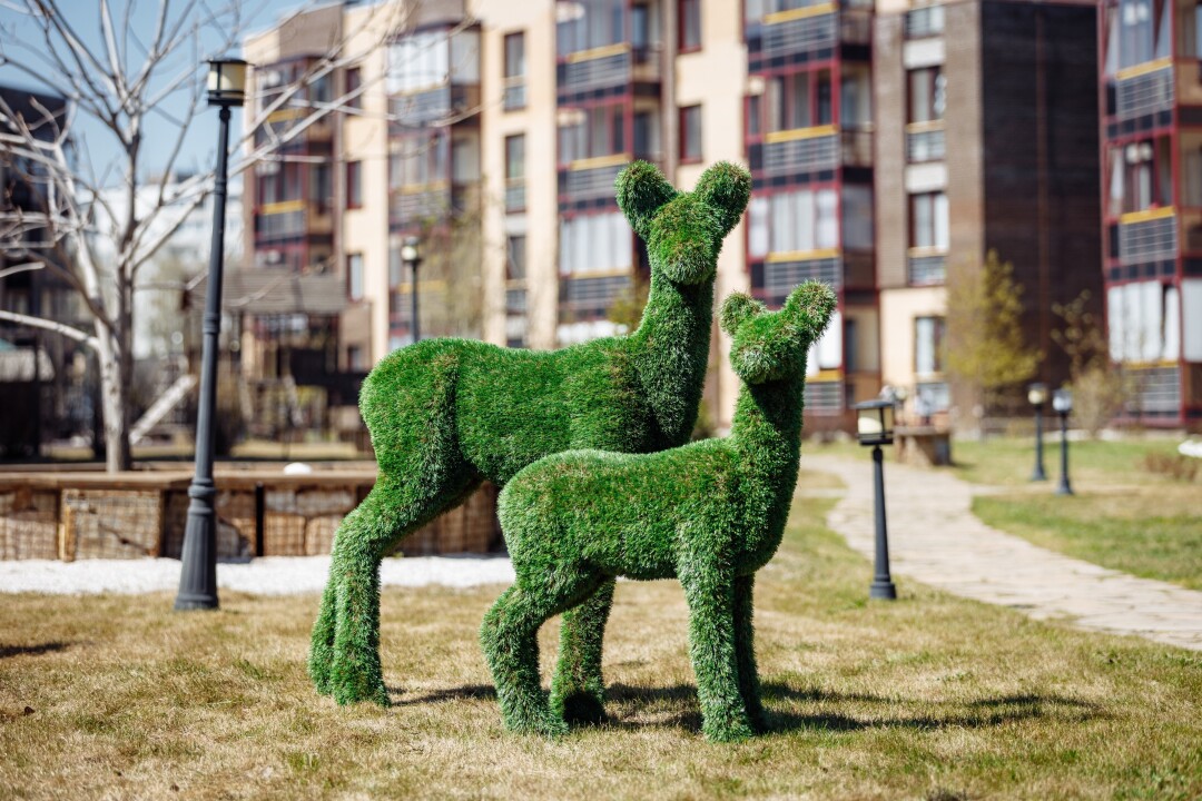 А чуть более года назад команда нарастила еще одну компетенцию и занялась производством топиарных фигур — масштабных конструкций из морозостойкого искусственного газона на металлическом каркасе, которые добавляют пространству ощущения диснеевской сказки или Нарнии.