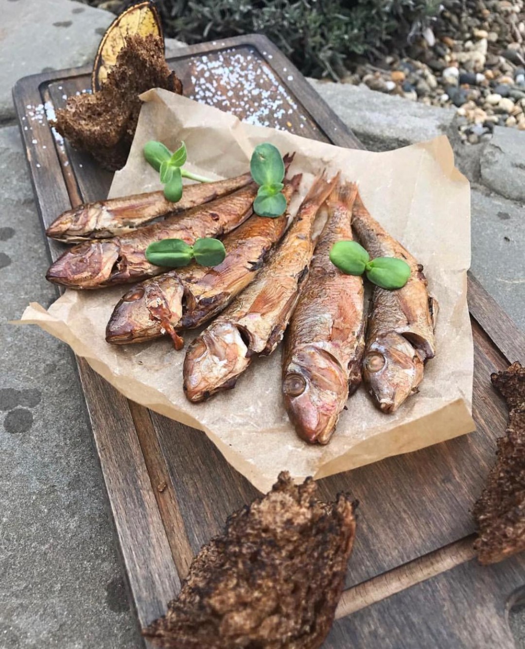 Черноморскую барабулю горячего копчения и свиные языки с картофелем гриль от шеф-повара Ярослава Гурского. Эти блюда составят прекрасные эногастрономические пары вину “Усадьба Мысхако”.