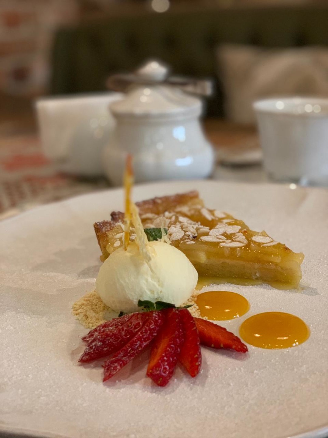 Состав пирога: мягкое песочное тесто на лимоном Ликере, груша, крем патисьер, карамельный крем для основы, лепестки миндаля, домашнее ванильное мороженое, чипсы из сыра пармезан.
