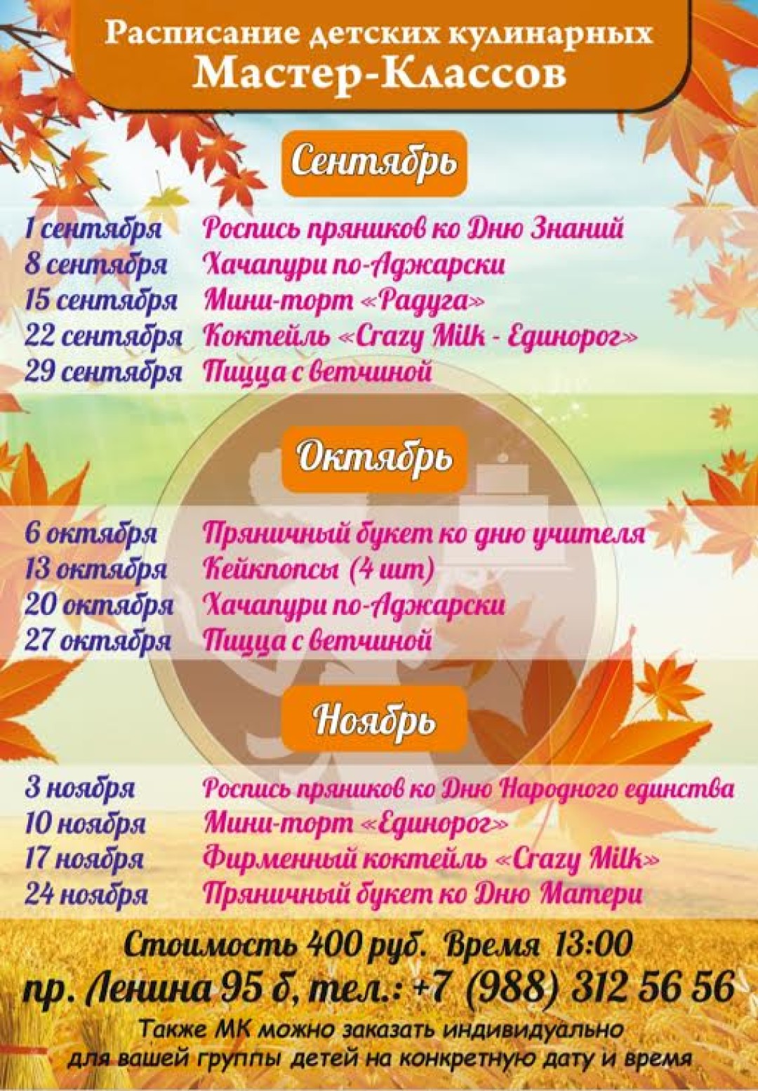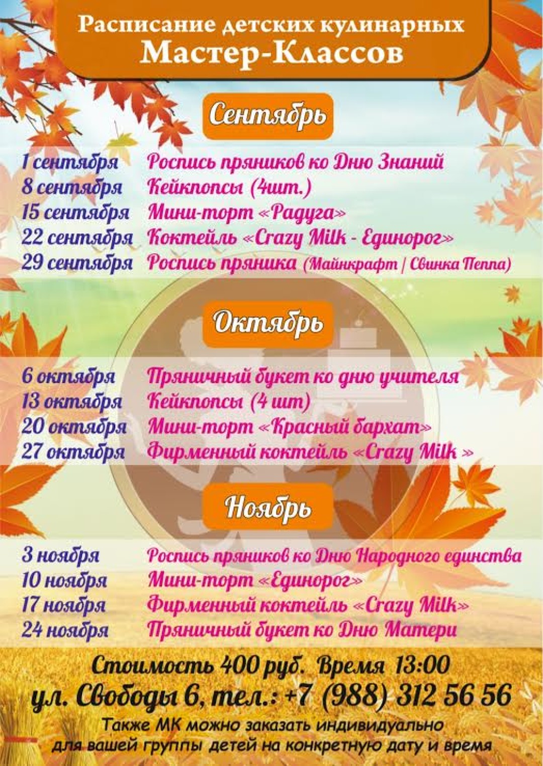В кондитерской каждое воскресенье проходят кулинарные мастер-классы для детей от 3х лет, также вы можете заказать детский кулинарные мастер-класс на конкретную дату и время.