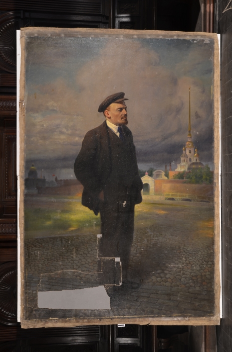 Что именно сподвигло Владислава Измайловича написать портрет Ленина в год его смерти таким весьма необычным образом, похоже, навсегда останется загадкой. Вероятно, художник понимал, что советская власть не будет вечной и история расставит все на свои места. Возможно, в 1920-е годы был тотальный дефицит, подтолкнувший художника к этому шагу (справедливости ради стоит отметить, что вторичное использование холстов было вполне распространенной историей — в Русском музее таких примеров достаточно). Так или иначе, Измайлович взял на себя смелость, рискуя репутацией и свободой, закрасить портрет Николая II краской, причем, такой, что любой при желании мог бы снять ее обычным мылом. На обратной стороне закрашенного холста художник написал портрет Вождя на фоне Иоанновских ворот Петропавловской крепости и великокняжеской усыпальницы.