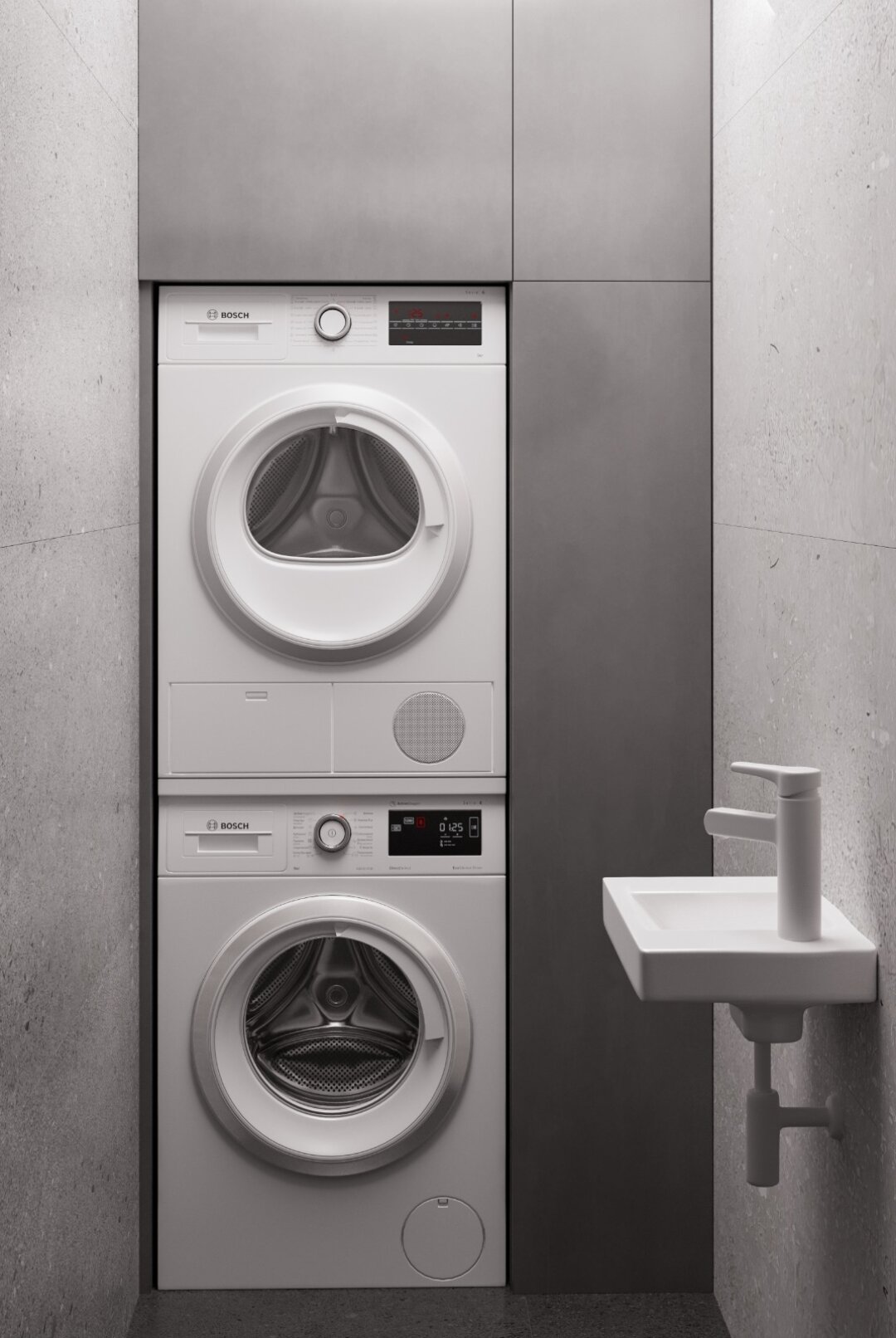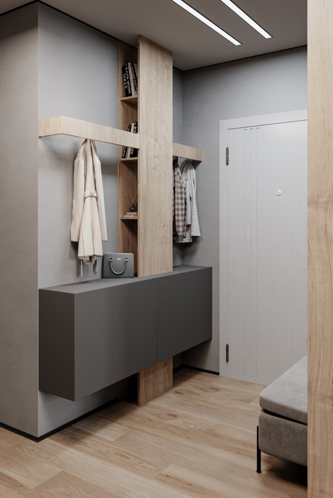 Системы хранения и даже постирочная вписаны в архитектуру квартиры, сохраняя порядок и эстетику.