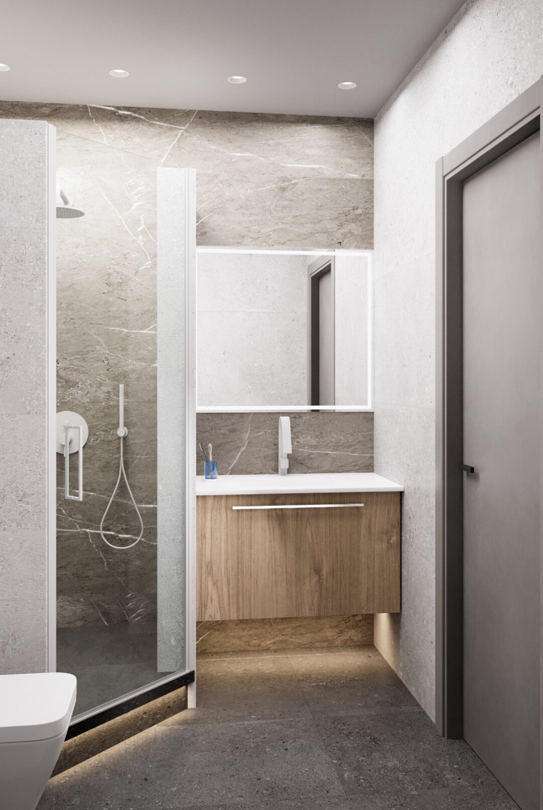 Плавное «перетекание» материалов и оттенков формирует ощущение цельности и спокойствия.